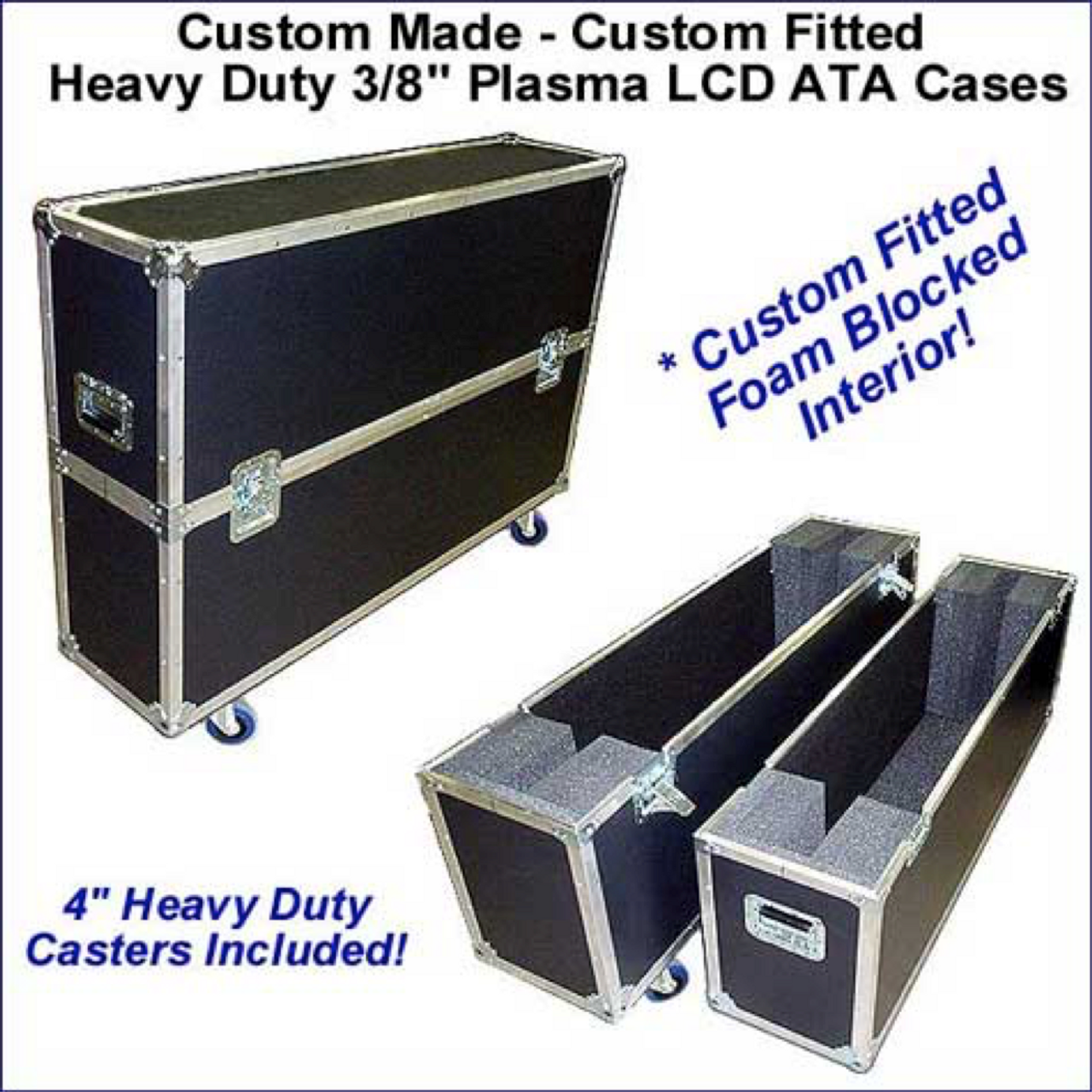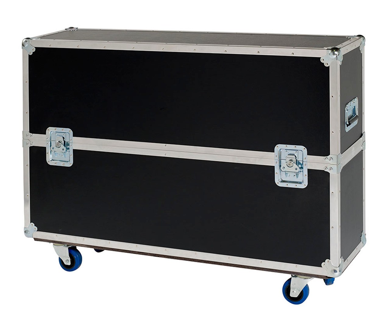 These customized heavy duty 3/8" ply 61-70” single LED LCD Flat Screen TV cases are equipped with a heavy weight black PVC hard laminate and enclosed in aluminum extrusion and machine split riveted together. Our LCD cases are then finished with 4 top quality spring loaded large recessed catches and 2 strong recessed spring loaded handles (one on each end). All the hardware is effectively plated for protection against corrosion. Each case also includes 4" heavy duty swivel casters mounted on a full length wheel board for strength. These high quality plasma cases are made in the USA. Built for sturdiness, reliability and ease of use, Road Cases USA offers the premier choice in equipment transport and protection. Shipping includes delivery on the truck to your curb/dock and does not include any "liftgate" fees for unloading.We ship to Hawaii & Alaska as well as internationally, but can only provide free shipping to the lower 48 US states at this time. Please email, phone or text us for a quote for air, expedited, and international delivery options.