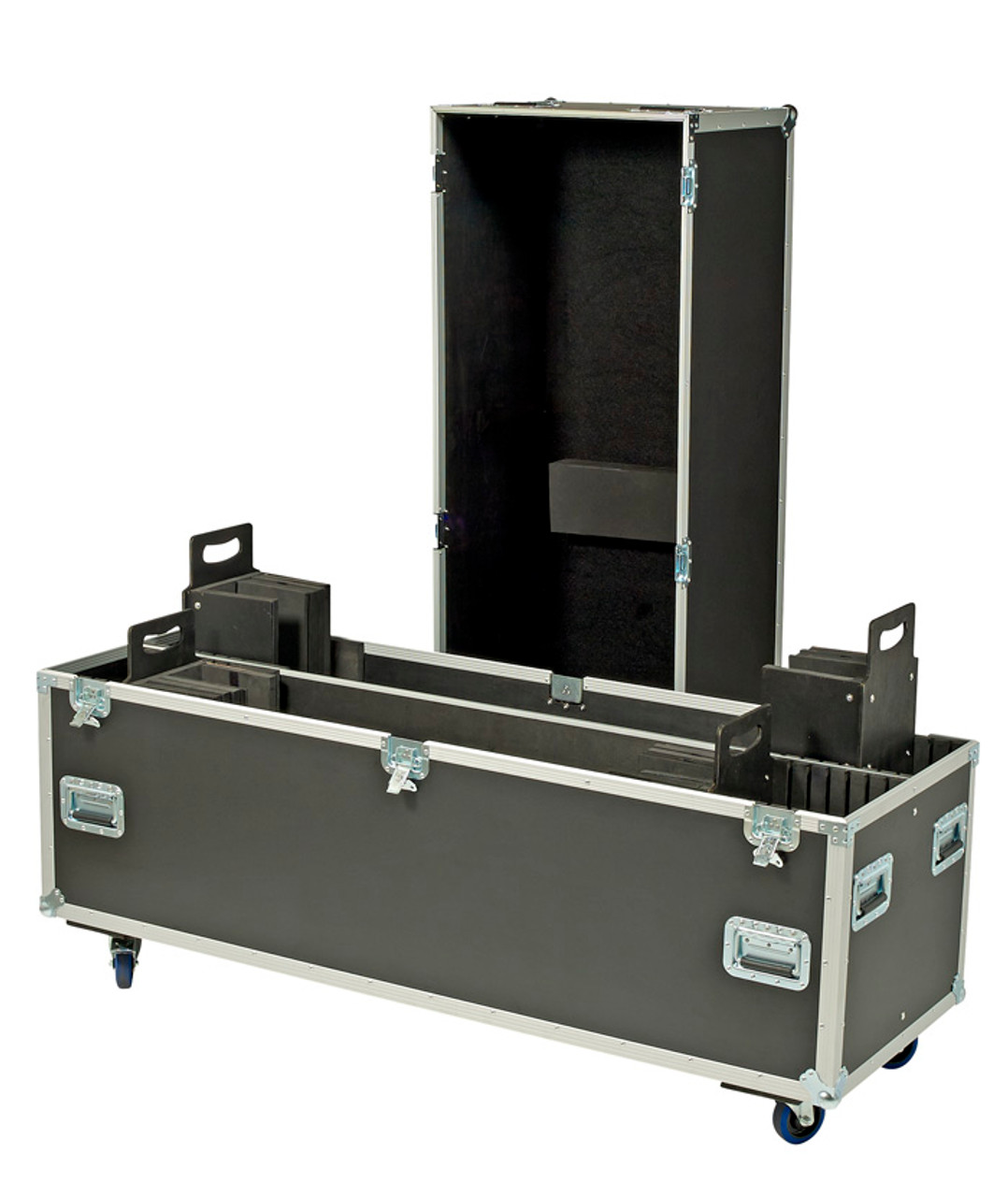 A very versatile ATA heavy duty case which adjusts to fit many different size plasma TV's. LCD's, LED's, flat screens, Etc. You no longer have to be stuck with only one size case for each size TV. You can now easily change TV's using the same case with the use of our unique adjustable u-block system. Its quick and easy! Also you can form handy compartments on either end of the case or on BOTH ends for stands, cables, clamps, Etc, This case is indeed a very handy and versatile case for the professional who needs to move their TV's from place to place without the need of a custom size case for each TV. Shipping includes delivery on the truck to your curb/dock and does not include any "liftgate" fees for unloading. We ship to Hawaii & Alaska as well as internationally, but can only provide free shipping to the lower 48 US states at this time. Please email, phone or text us for a quote for air, expedited, and international delivery options.