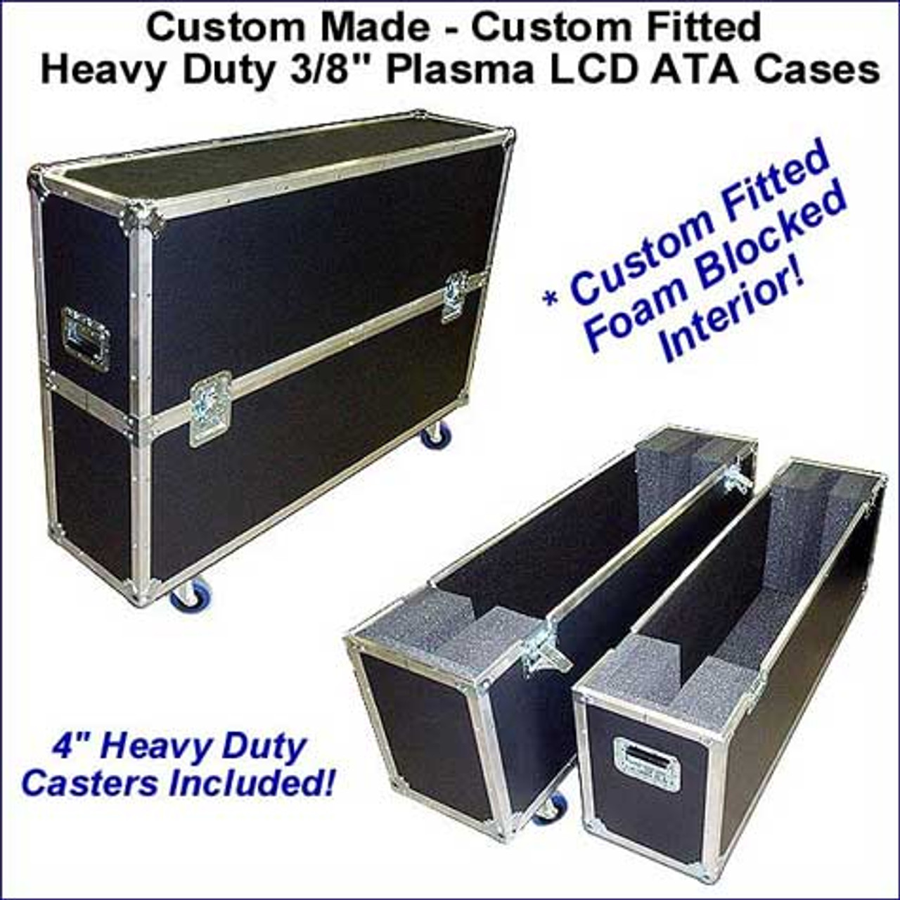 Our heavy duty single TV cases are custom fit to you 71-80" flat screen display. We build these to last, with heavy duty 3/8" thick ply wrapped in heavy weight black PVC hard laminate and bounded in aluminum extrusion. They're also permanently machine split riveted together. These durable LCD cases are finished with 4 high quality spring loaded large recessed catches and 2 strong recessed spring loaded handles, one on each end. All hardware is plated for protection against corrosion - a feature that makes them long-lasting. Each case also includes 4" heavy duty swivel casters mounted on a full length wheel board for added strength. Shipping includes delivery on the truck to your curb/dock and does not include any "liftgate" fees for unloading. We ship to Hawaii & Alaska as well as internationally, but can only provide free shipping to the lower 48 US states at this time. Please email, phone or text us for a quote for air, expedited, and international delivery options.