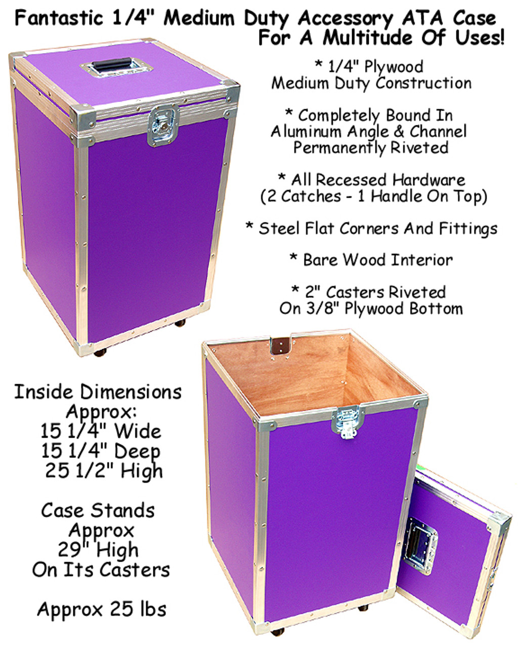 This case is constructed of 1/4" plywood with a thick PVC laminate on the outside and a bare wood interior. The case is assembled with heavy gauge aluminum extrusions machine split riveted throughout. The corners are protected by heavy gauge steel flat corners and fittings. The two catches and one handle are recessed into the case to ensure their protection. The inside of the case measures 15 1/4" X 15 1/4" X 25 1/2 high (wood to wood) and top handle is high is high enough (29") for easy rolling and lifting. This case has multiple uses and is offered in multiple colors! We ship to Hawaii & Alaska as well as internationally, but can only provide free shipping to the lower 48 US states at this time. Please email, call or text us for a quote for air, expedited, and international delivery options.