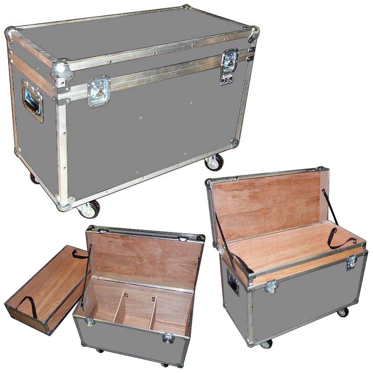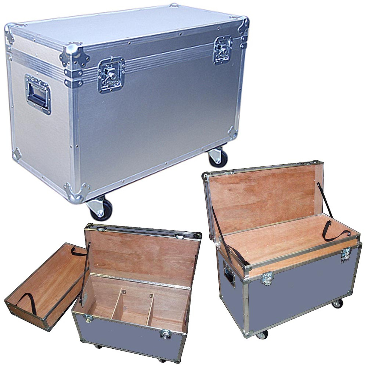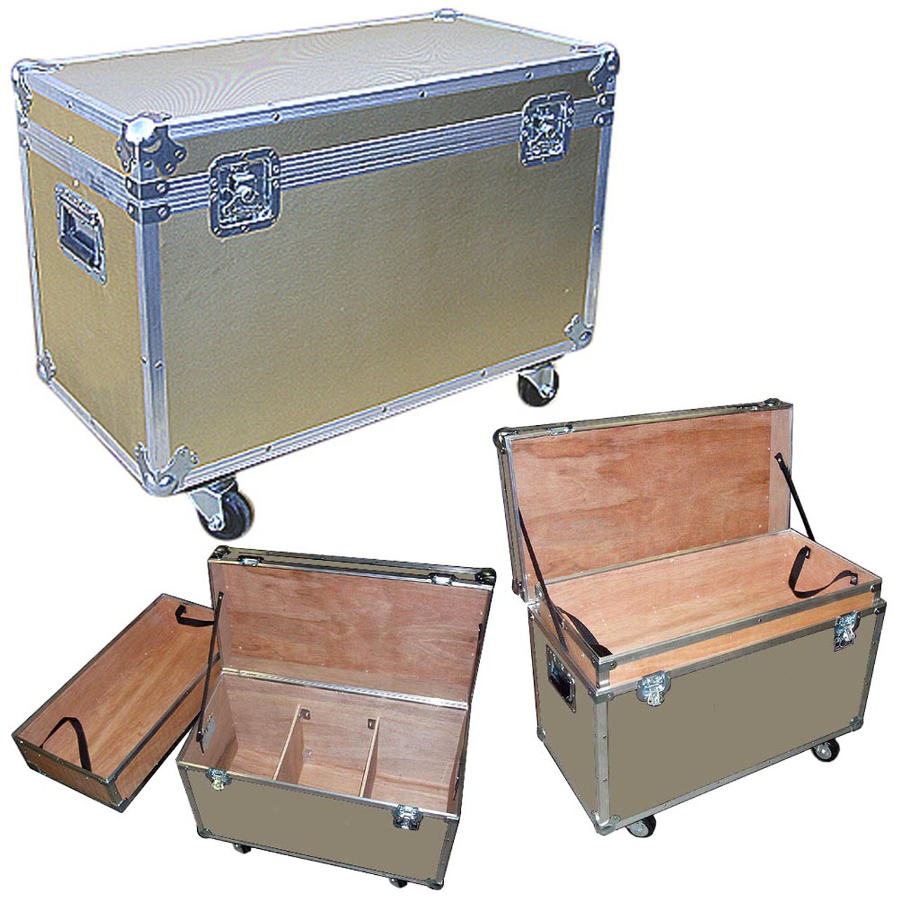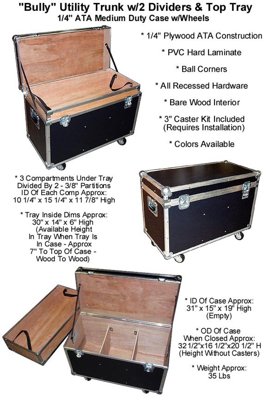 This ATA "BULLY" Supply Trunk 1/4" Medium Duty Case is made by a leading case manufacturer and is brand new! The case is constructed of 1/4" plywood with a thick plastic laminate on the outside and a bare wood inside. A sheet of foam is supplied for your own customizing use. The case is assembled with heavy gauge aluminum extrusions machine split riveted throughout and the corners are protected by heavy gauge steel ball corners. All the catches and handles are spring loaded and recessed into the case for strength and shear resistance. They are specifically designed for a tight positive closure and easy lifting. The lid hinges open and there are also heavy duty 3" swivel casters included which require installation. There are two dividers which form 3 compartments under the top tray. A very useful utility case for almost anything needed to consolidate or transport. We ship to Hawaii & Alaska as well as internationally, but can only provide free shipping to the lower 48 US states at this time. Please email, phone or text us for a quote for air, expedited, and international delivery options.