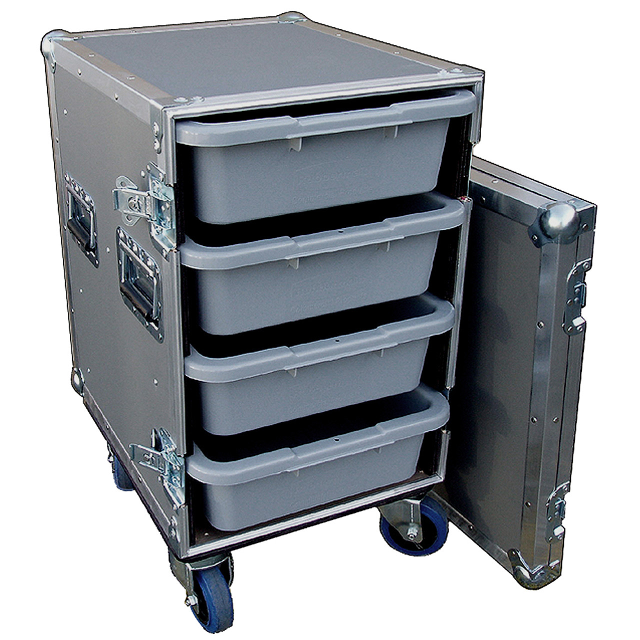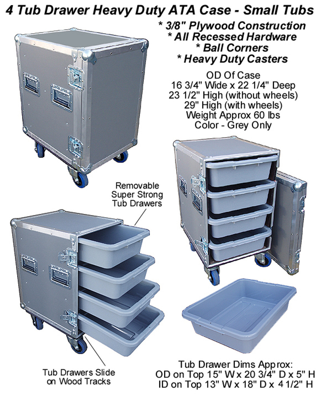 This 4 Small Tub/Drawer Heavy Duty ATA Case w/Wheels was produced by a leader in the ATA transit case industry and is extremely useful! The case is constructed of 3/8" plywood with a heavy PVC grey vinyl laminate on the face and a black stained interior. Tub drawers are practically unbreakable, lightweight, and are a great and unique feature to this case. The case also has all recessed hardware to prevent shearing off in transit and heavy duty casters also come with the case. We ship to Hawaii & Alaska as well as internationally, but can only provide free shipping to the lower 48 US states at this time. Please email, phone or text us for a quote for air, expedited, and international delivery options.