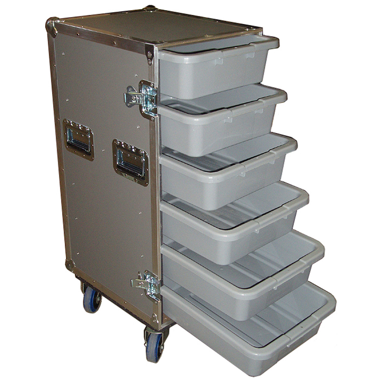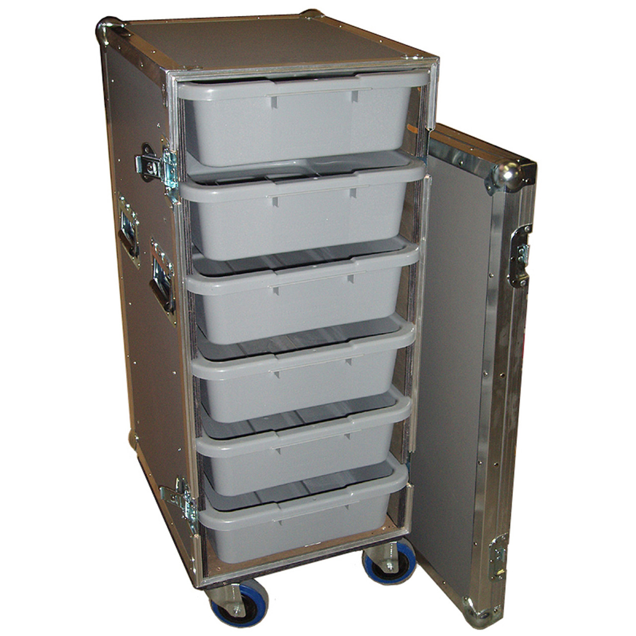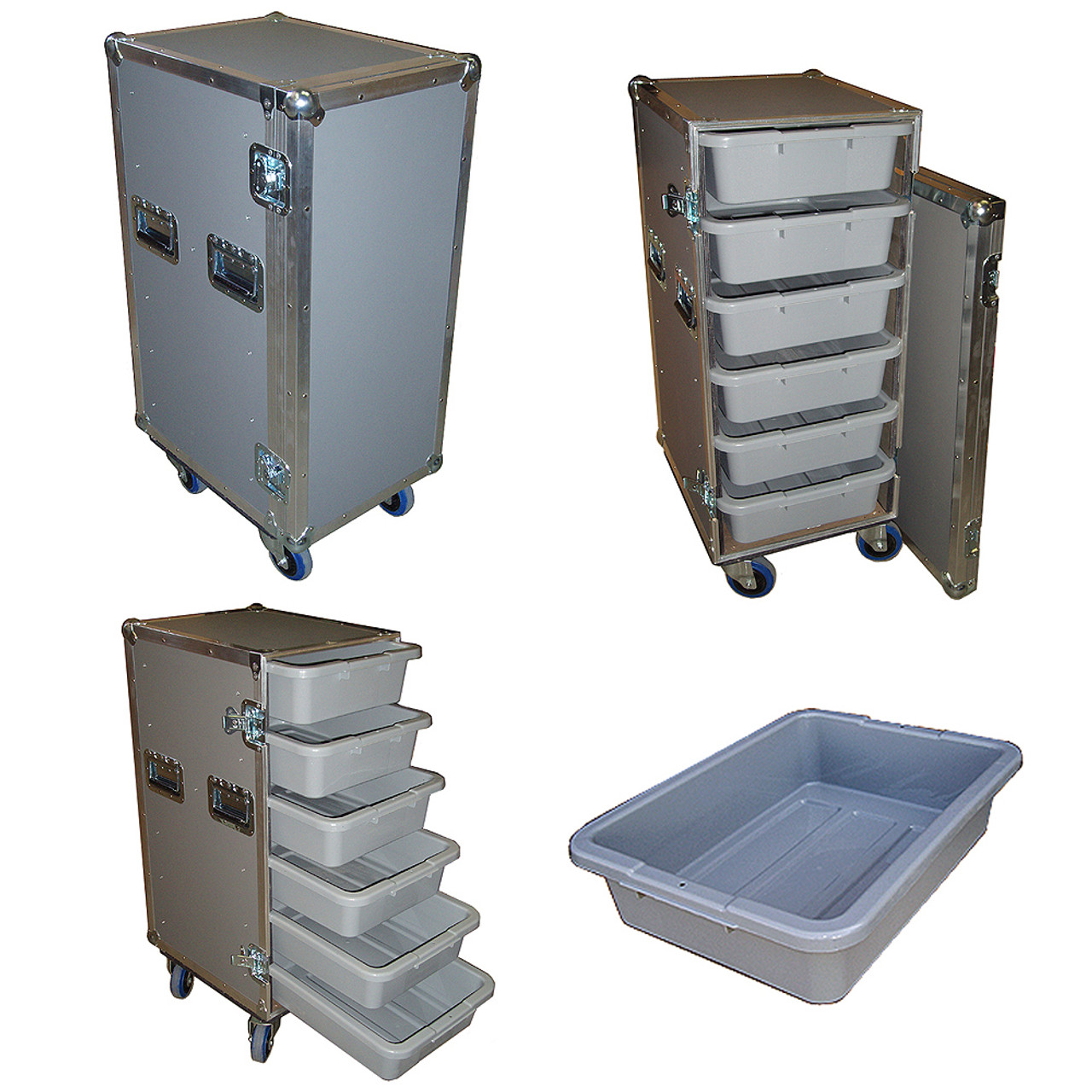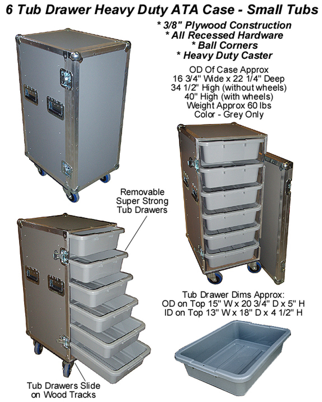 This 6 Small Tub/Drawer Case with Wheels was produced by a leader in the ATA transit case industry and is extremely useful! The case is constructed of 3/8" plywood with a heavy PVC grey vinyl laminate on the face and a black stained interior. Tub drawers are practically unbreakable, lightweight, and are a great and unique feature to this case. The case also has all recessed hardware to prevent shearing off in transit and heavy duty casters also come with the case. We ship to Hawaii & Alaska as well as internationally, but can only provide free shipping to the lower 48 US states at this time. Please email, phone or text us for a quote for air, expedited, and international delivery options.