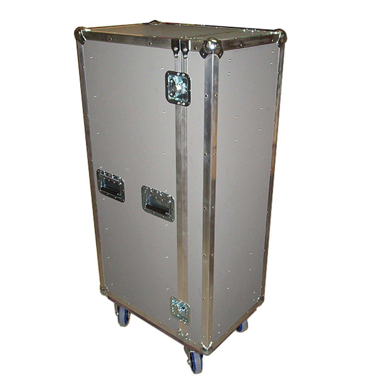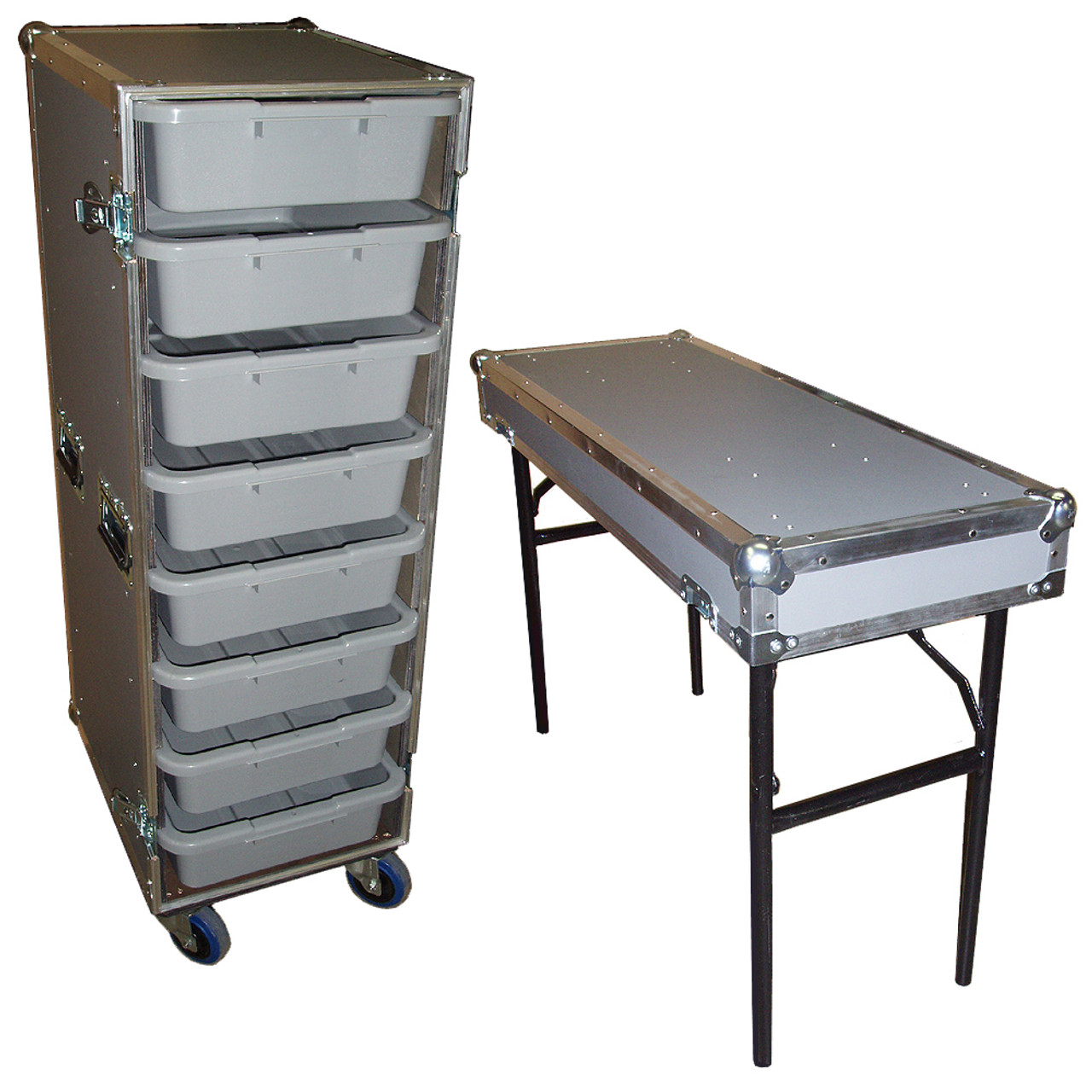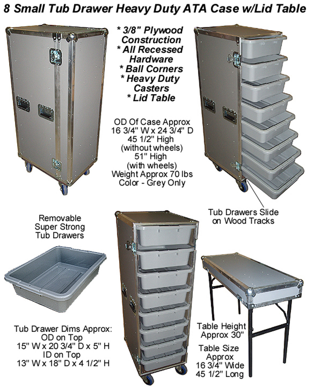 This 8 Small Tub/Drawer w/ Lid Table and Wheels was produced by a leader in the ATA transit case industry and is extremely useful! The case is constructed of 3/8" plywood with a heavy PVC grey vinyl laminate on the face and a black stained interior. Tub drawers are practically unbreakable, lightweight, and are a great and unique feature to this case. The case also has all recessed hardware to prevent shearing off in transit and heavy duty casters also come with the case. We ship to Hawaii & Alaska as well as internationally, but can only provide free shipping to the lower 48 US states at this time. Please email, phone or text us for a quote for air, expedited, and international delivery options.