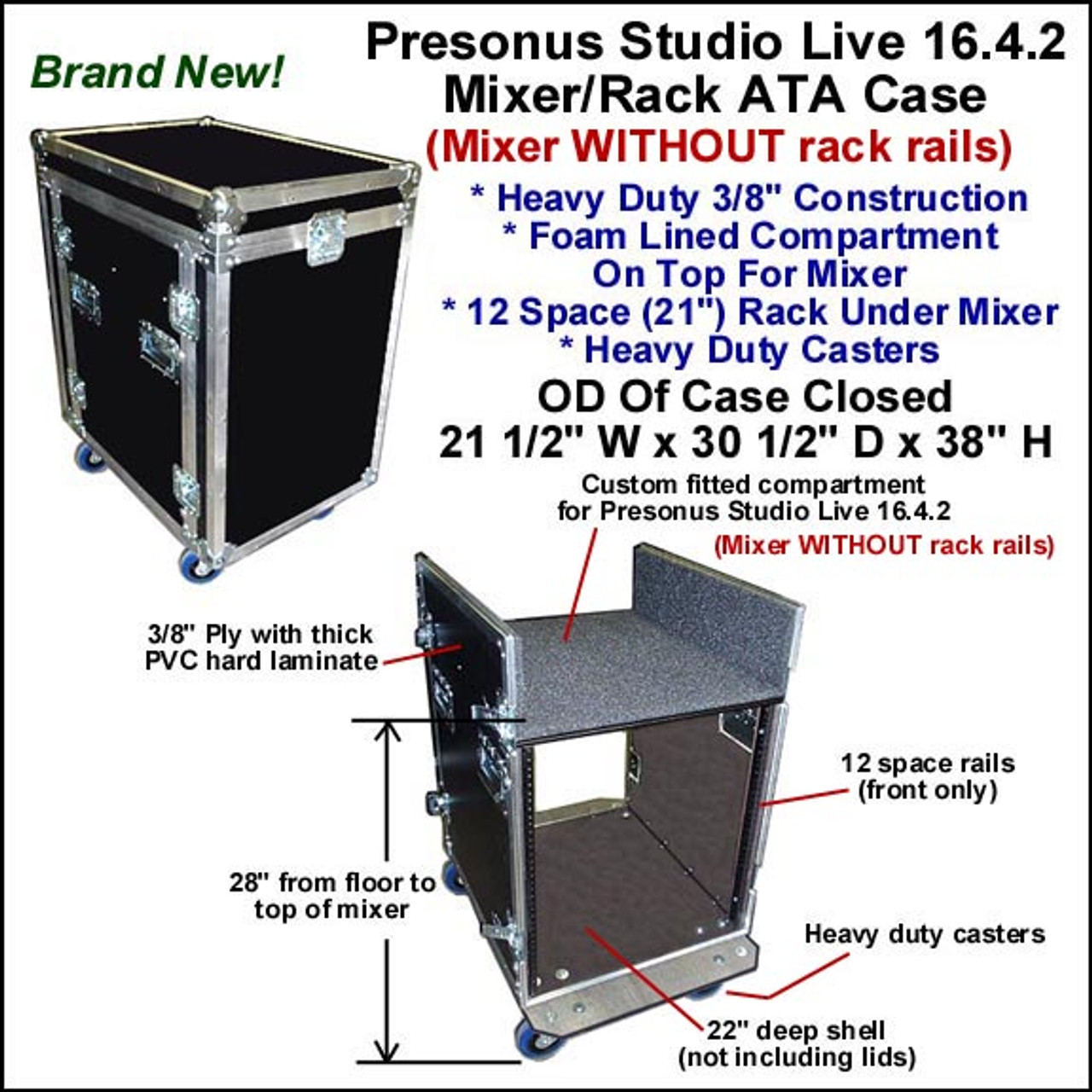This full Presonus studio live 24.4.2 ATA 3/8” mixer case retails for much more than this price at most music dealers. The rack case is custom made to fit the Presonus Studio Live 16.4.2. This mixer case is constructed of 3/8" plywood with a thick rubberized plastic laminate and heavy gauge aluminum extrusions riveted throughout. It is then finished with all high quality recessed hardware and the mixer compartment on top is completely foam lined to form fit the unit. Other excellent features such as a deep shell and front-side space rails lend to this product’s mobility, accessibility and durability. We ship to Hawaii & Alaska as well as internationally, but can only provide free shipping to the lower 48 US states at this time. Please email, phone or text us for a quote for air, expedited, and international delivery options.