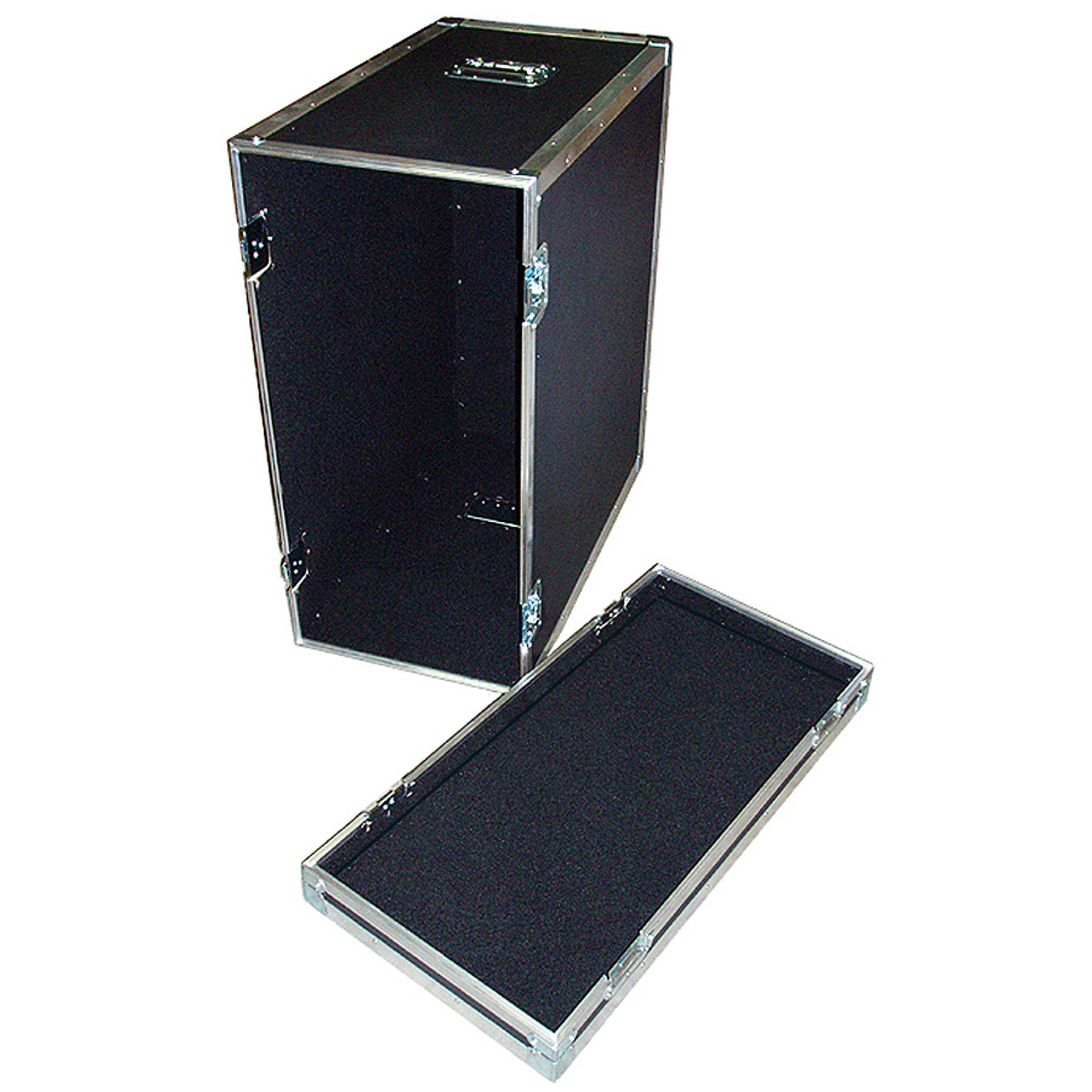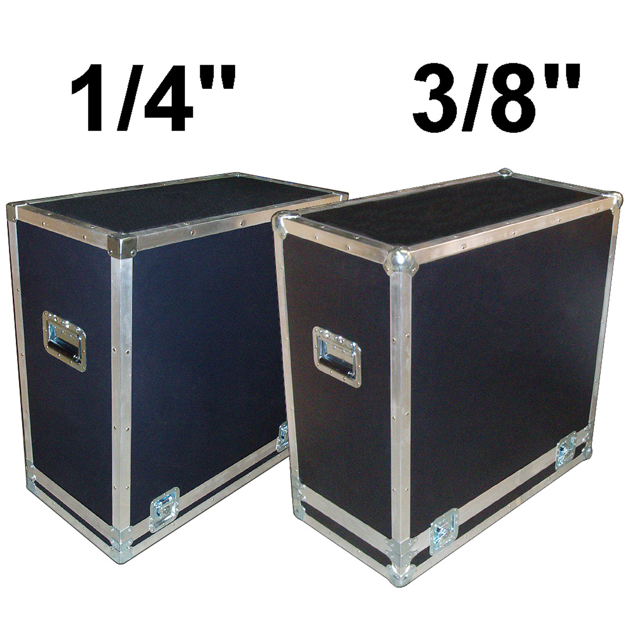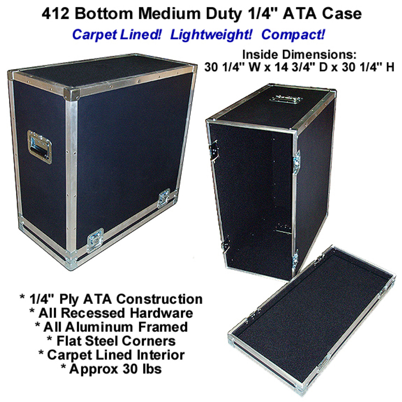 This roadie case is specifically custom made for the MARSHALL 412 CABINET or similar 412 bottoms. We ship the tray portion of the case inside the top on the medium duty 1/4" case and we ship the 3/8" version in two separate boxes UPS. This speaker cabinet case is constructed of 1/4" or 3/8" plywood with a black vinyl or PVC laminate and heavy gauge aluminum extrusions riveted throughout. It is finished with all fine rust resistant plated recessed hardware fittings and steel corners. The inside has a thick black carpet lining for protection of your units. It is ABSOLUTELY ESSENTIAL that you physically measure your unit before purchasing and check your dimensions against the dimensions listed here to avoid any errors. Many manufacturers' makes and models of equipment vary in size from year to year even though it may have the same model number. The ID of this road case from carpet to carpet is: 30 1/4" x 14 3/4" x 30 1/4" high. Some Marshall cabinets come with casters attached to the bottom but will probably have to be removed to fit in this case. Approx OD of this case is: 32" x 16" x 31" high. We ship to Hawaii & Alaska as well as internationally, but can only provide free shipping to the lower 48 US states at this time. Please email, phone or text us for a quote for air, expedited, and international delivery options.