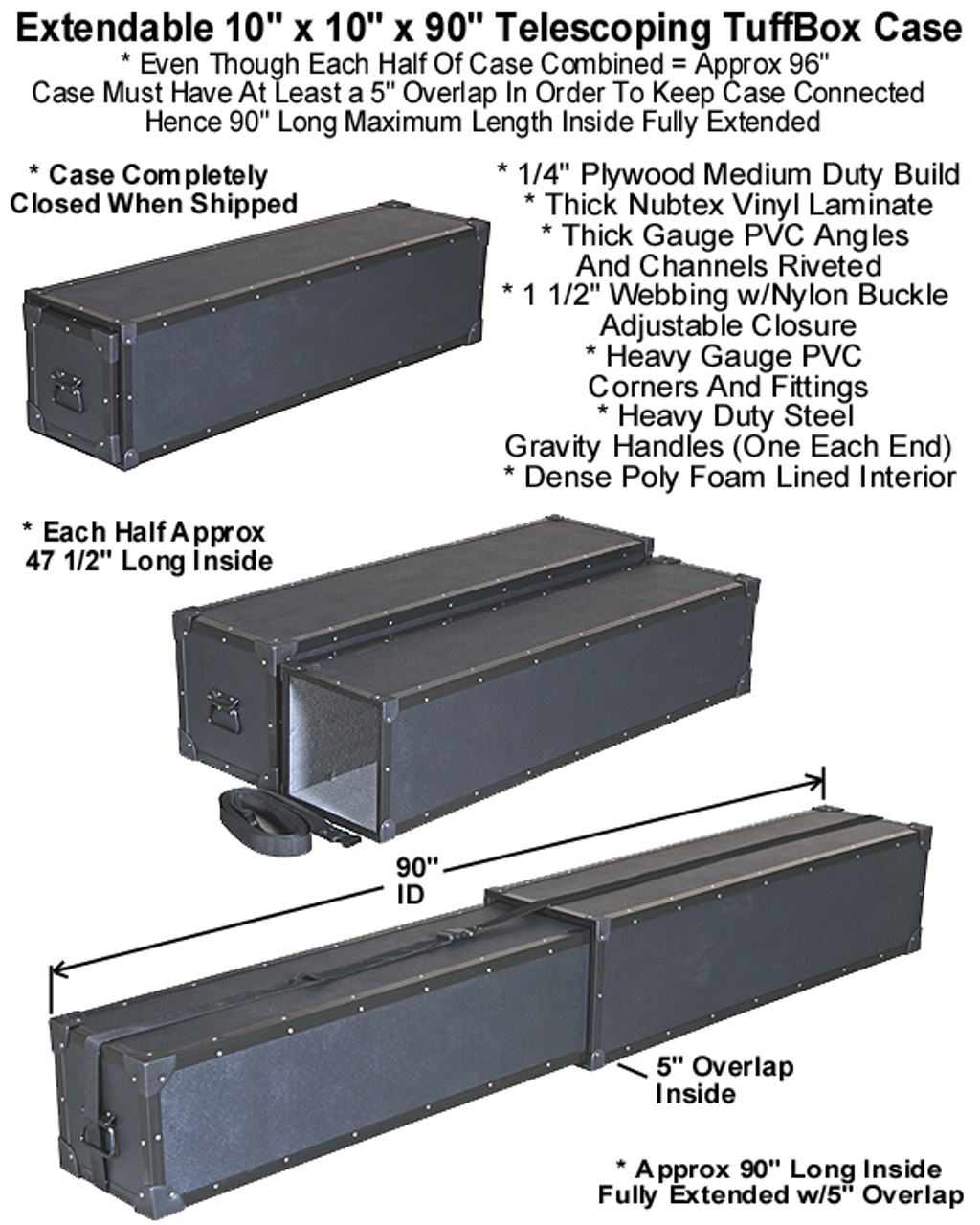 - Each Half Of Case Approx 47 1/2" Long Inside = Approx 90" Inside Put Together w/5" Overlap