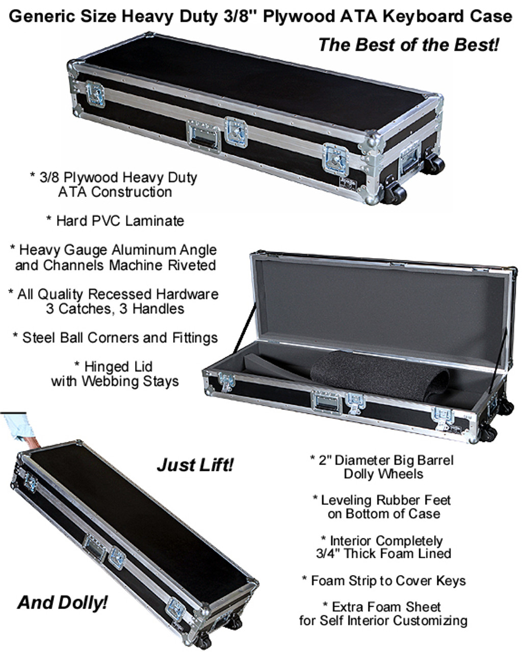 The "Signature Series" is our most popular ATA case lined with industry leading 1” foam for protection. The Signature Series Keyboard Case comes standard with 3/8" plywood (w/ lightweight 1/4" ply and heavy duty 1/2" ply options available). The exterior has a thick PVC plastic laminate and is riveted with heavy gauge aluminum extrusions throughout. It features all large recessed hardware and large steel ball corners. The inside is entirely foam lined with 1" soft foam.