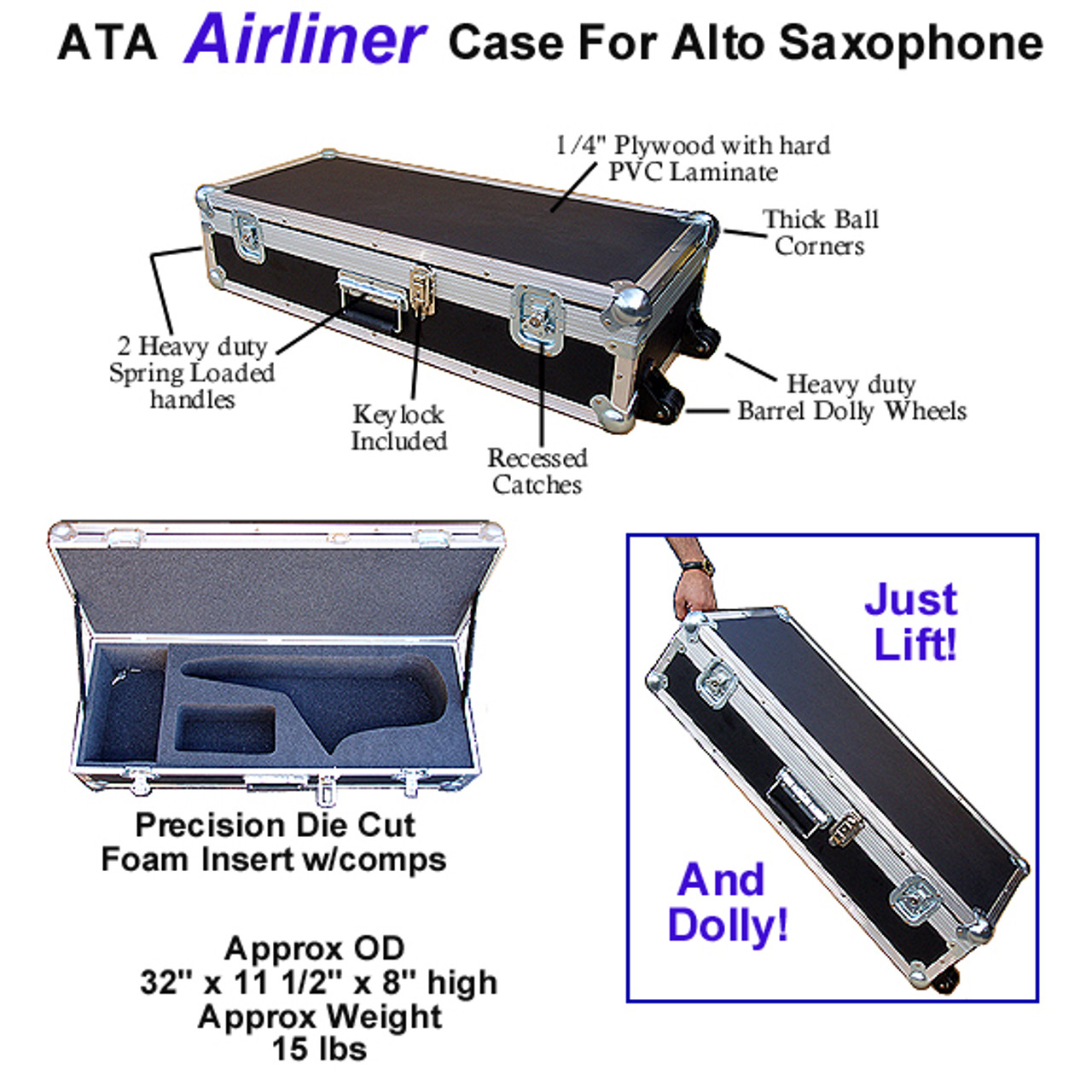 This heavy duty Alto Saxophone ATA Airliner case is made to take the hits of the road. It retails for over $350 in music supply houses but we are selling it for this incredible low price! The case is constructed of 1/4" plywood with a thick plastic laminate on the outside and a die cut foam inside. The case is assembled with heavy gauge aluminum extrusions machine split riveted throughout and the corners are protected by heavy gauge steel ball corners. All the catches are spring loaded and recessed into the case for strength and shear resistance. The lid hinges open and there are also heavy duty barrel dolly wheels mounted to the end of the case for ease of rolling.