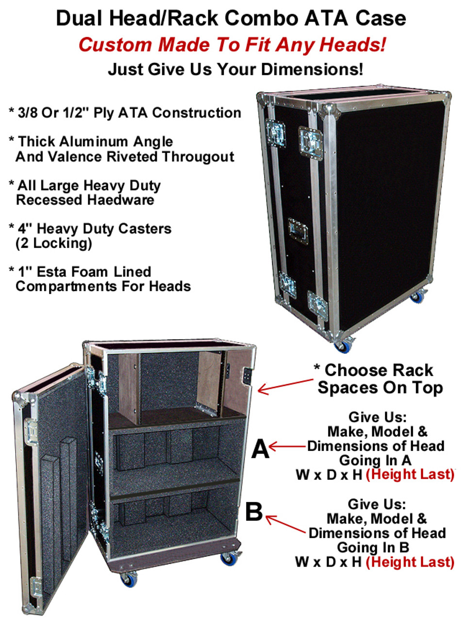 Road Cases USA’s custom made heavy duty rack and head combo cases with sturdy 3/8” heads are constructed with thick plywood and rugged PVC Black laminate. They are completely surrounded with thick aluminum extrusion which is permanently machine riveted together. All recessed hardware is used to finish the case and 4" heavy duty casters (2 of which are locking) are also included. This is a real bargain at an incredibly low price with great quality! Shipping includes delivery on the truck to your curb/dock and does not include any "liftgate" fees for unloading. We ship to Hawaii & Alaska as well as internationally, but can only provide free shipping to the lower 48 US states at this time. Please email, phone or text us for a quote for air, expedited, and international delivery options.