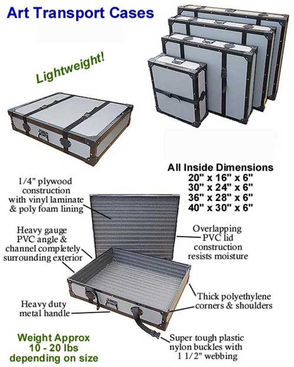Whether you’re an artist needing to store or transport your artwork or a sign manufacturer who wants to deliver signs to your clients, these specially designed portfolio cases with inside dimensions 20"x 16"x 6" are perfect for keeping signs, artwork, or valuable paintings protected from damage. Built solid with 1/4" plywood construction, heavy gauge PVC angles and channels surrounding the exterior, they are ideally suited for light transport and can be used to keep items protected while in storage. We also offer optional dolly wheels and an end handle that can be installed onto the case. We ship to Hawaii & Alaska as well as internationally, but can only provide free shipping to the lower 48 US states at this time. Please email, call or text us for a quote for air, expedited, and international delivery options.