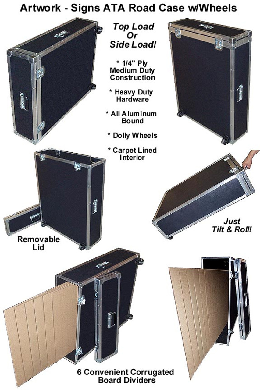 This innovative new Artwork and Sign ATA road case makes for a very easy to use transport case. It is designed specifically for transporting and protecting artwork or signs. It is manufactured with 1/4" plywood construction and heavy gauge aluminum angles and channels surrounding the exterior. The materials used are moisture resistant to protect your work. It can either be top loaded or side loaded for convenience. The case can be carried either sideways or use handy installed dolly wheels for complete convenience. The strategically placed handles allow you to do both. Six handy dividers are also supplied to keep your items separated and protected. We ship to Hawaii & Alaska as well as internationally, but can only provide free shipping to the lower 48 US states at this time. Please email, phone or text us for a quote for air, expedited, and international delivery options.