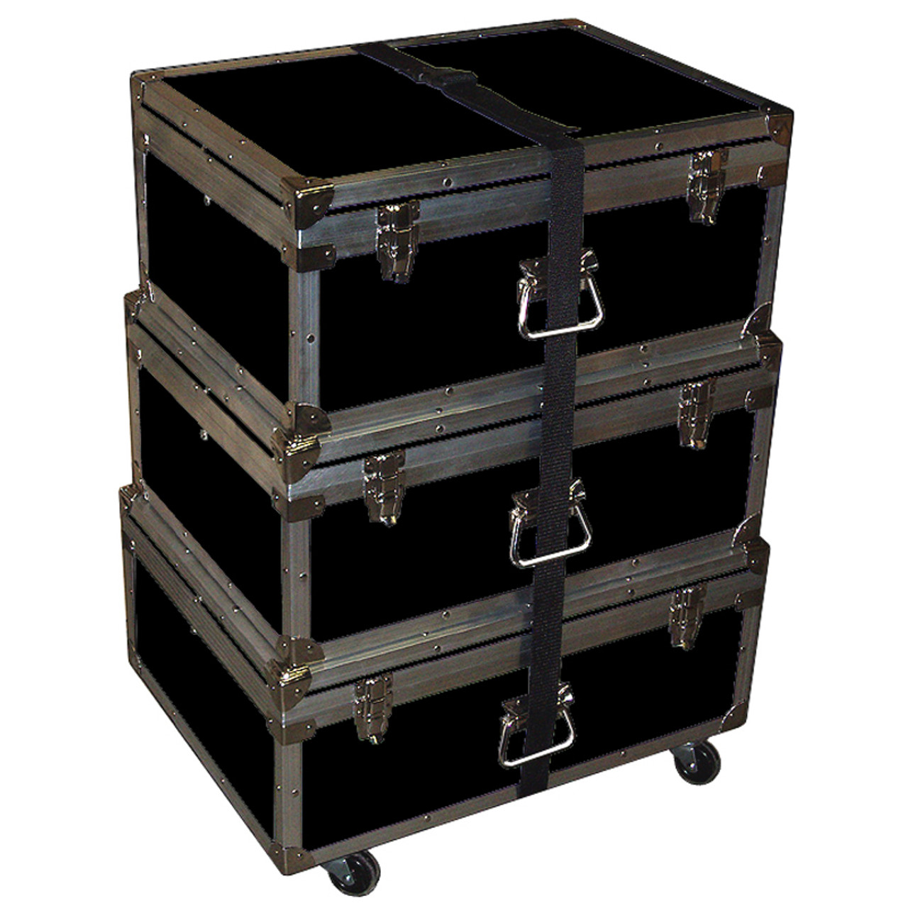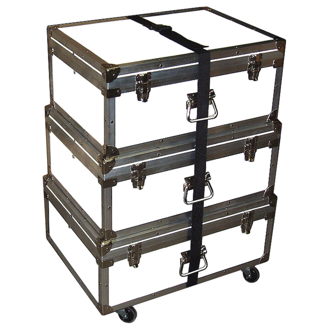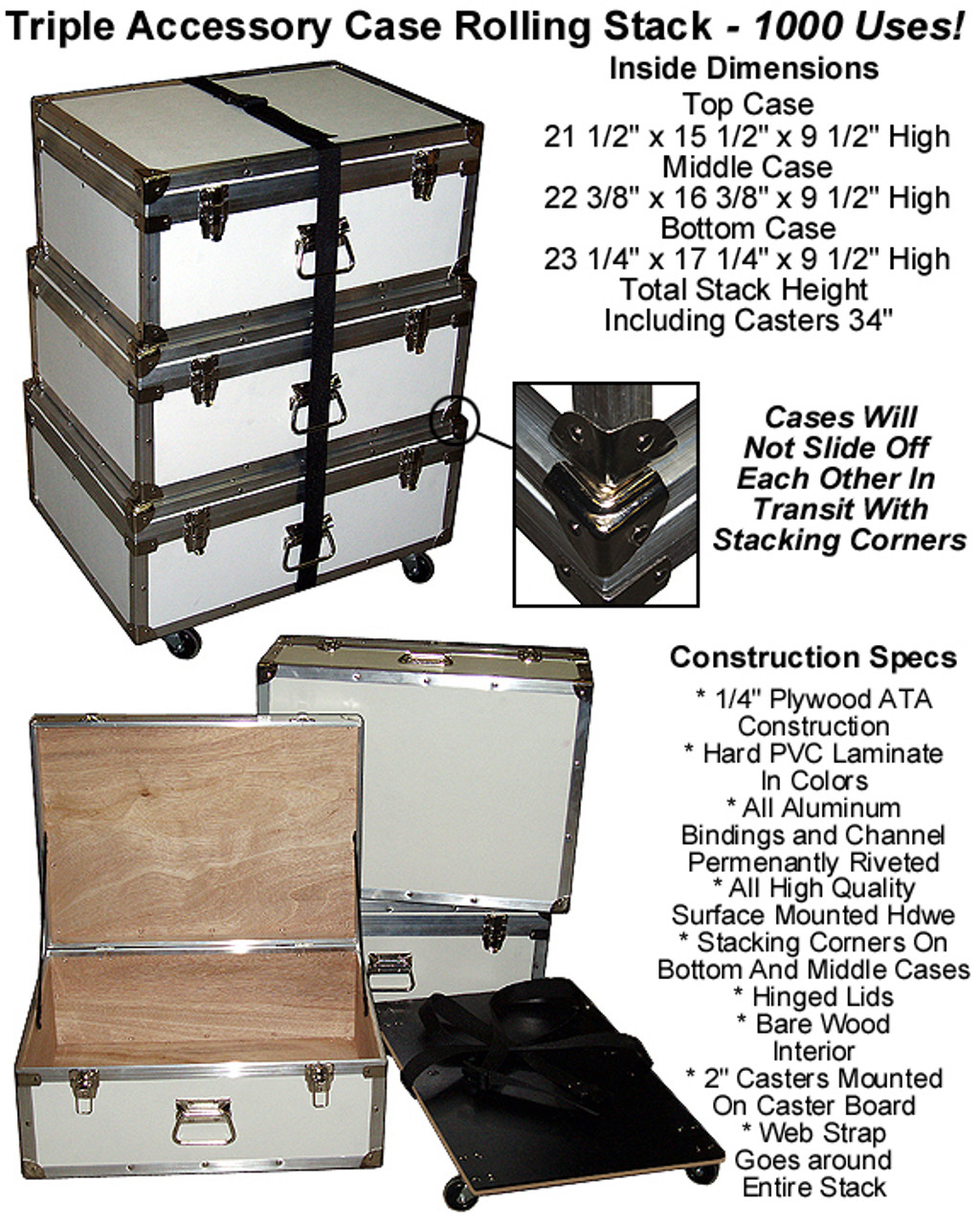 This 1/4" Triple Accessory Case Rolling Stack very versatile three case set is constructed of 1/4" plywood with a thick plastic PVC laminate which comes in many colors! The cases have a bare wood inside but can be lined with foam, carpet, or anything else you feel you need to protect and organize your products. The case is assembled with heavy gauge aluminum extrusions machine split riveted throughout and the stacking corners on the bottom and middle cases prevent the cases from moving and sliding off each other in transit. All the catches and handles are High quality surface mounted and very strong for these cases. They are specifically designed for a tight positive closure and easy lifting. The lids hinge open and each case has two webbing lid stays. The caster board has 2" swivel casters mounted to it and also the strap which surrounds the entire stack for travel. A very useful utility case for almost anything needed to consolidate or transport.