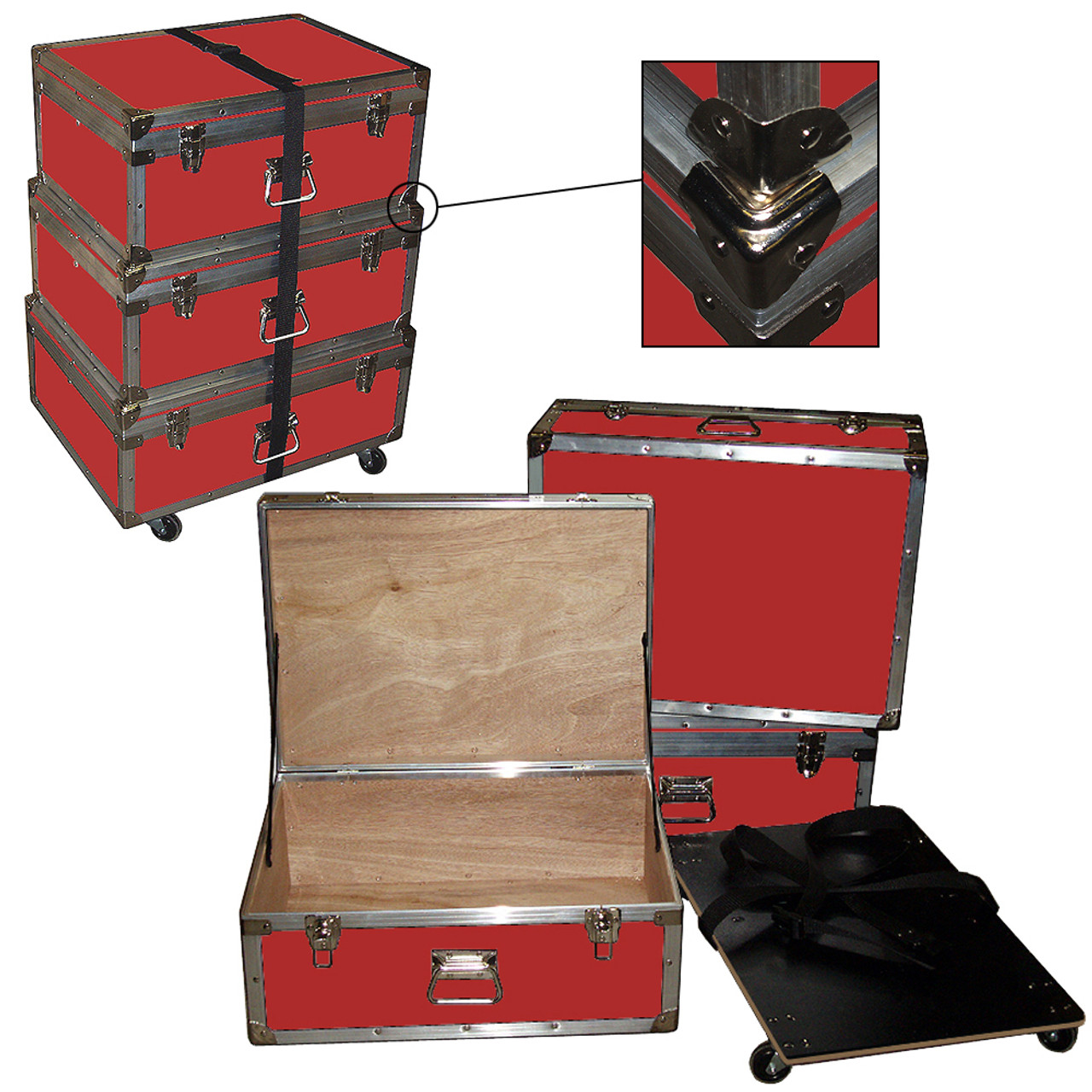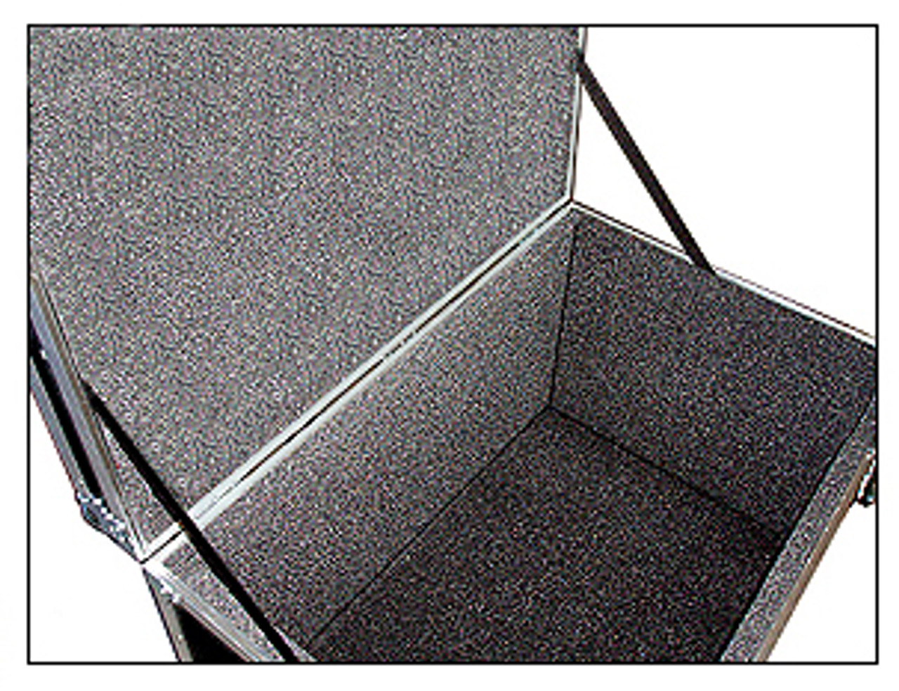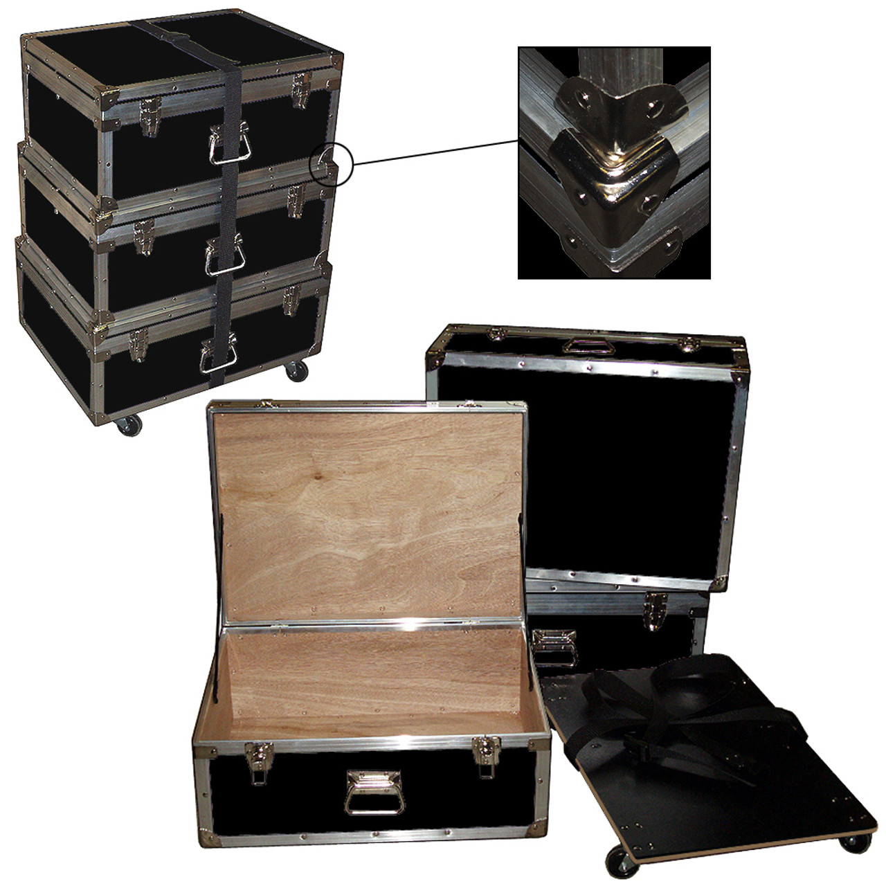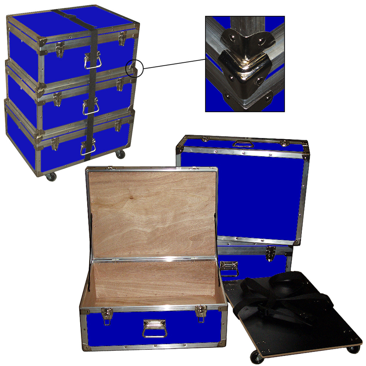 This 1/4" Triple Accessory Case Rolling Stack very versatile three case set is constructed of 1/4" plywood with a thick plastic PVC laminate which comes in many colors! The cases have a bare wood inside but can be lined with foam, carpet, or anything else you feel you need to protect and organize your products. The case is assembled with heavy gauge aluminum extrusions machine split riveted throughout and the stacking corners on the bottom and middle cases prevent the cases from moving and sliding off each other in transit. All the catches and handles are High quality surface mounted and very strong for these cases. They are specifically designed for a tight positive closure and easy lifting. The lids hinge open and each case has two webbing lid stays. The caster board has 2" swivel casters mounted to it and also the strap which surrounds the entire stack for travel. A very useful utility case for almost anything needed to consolidate or transport.