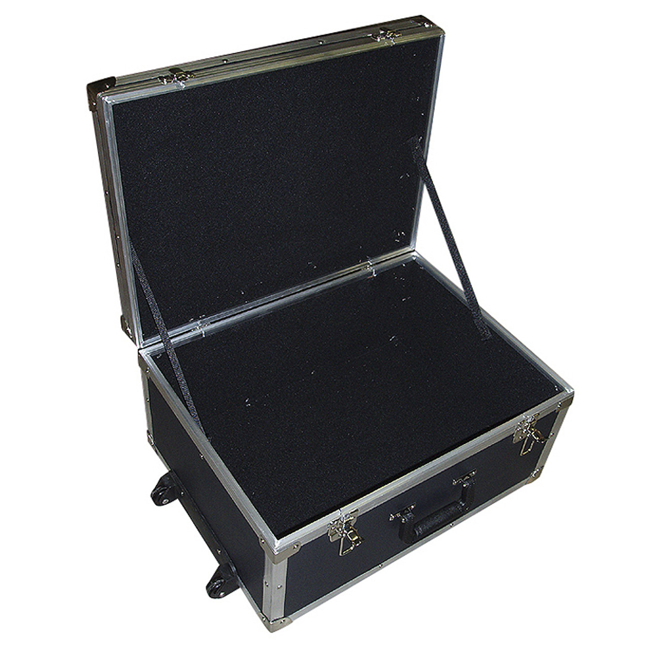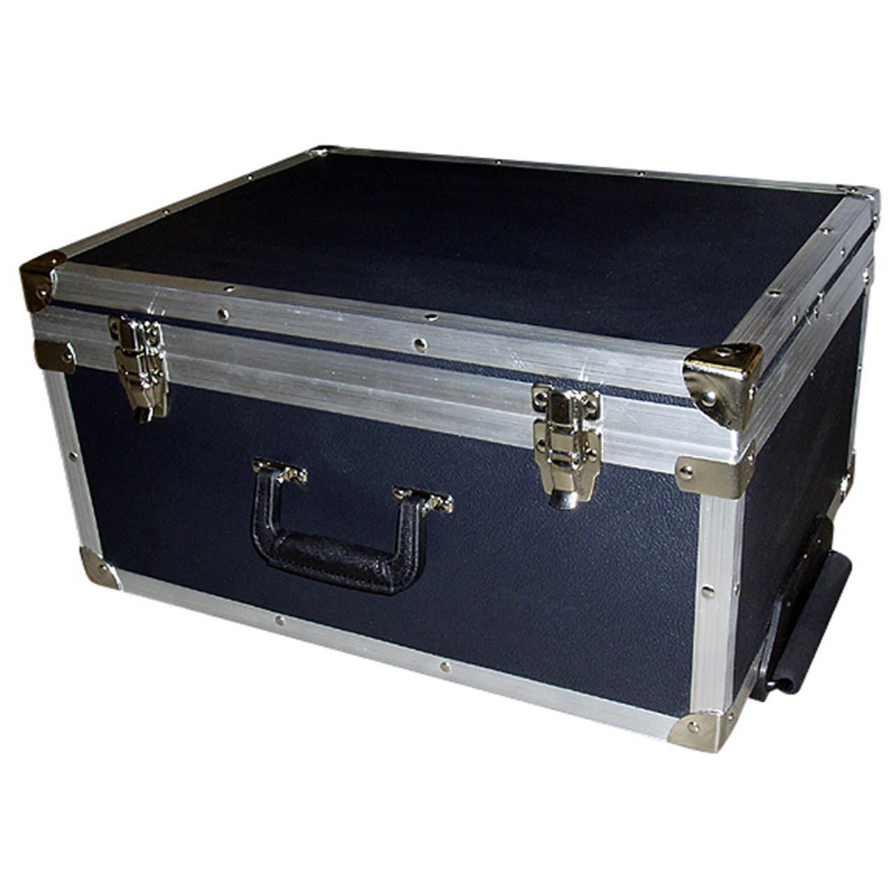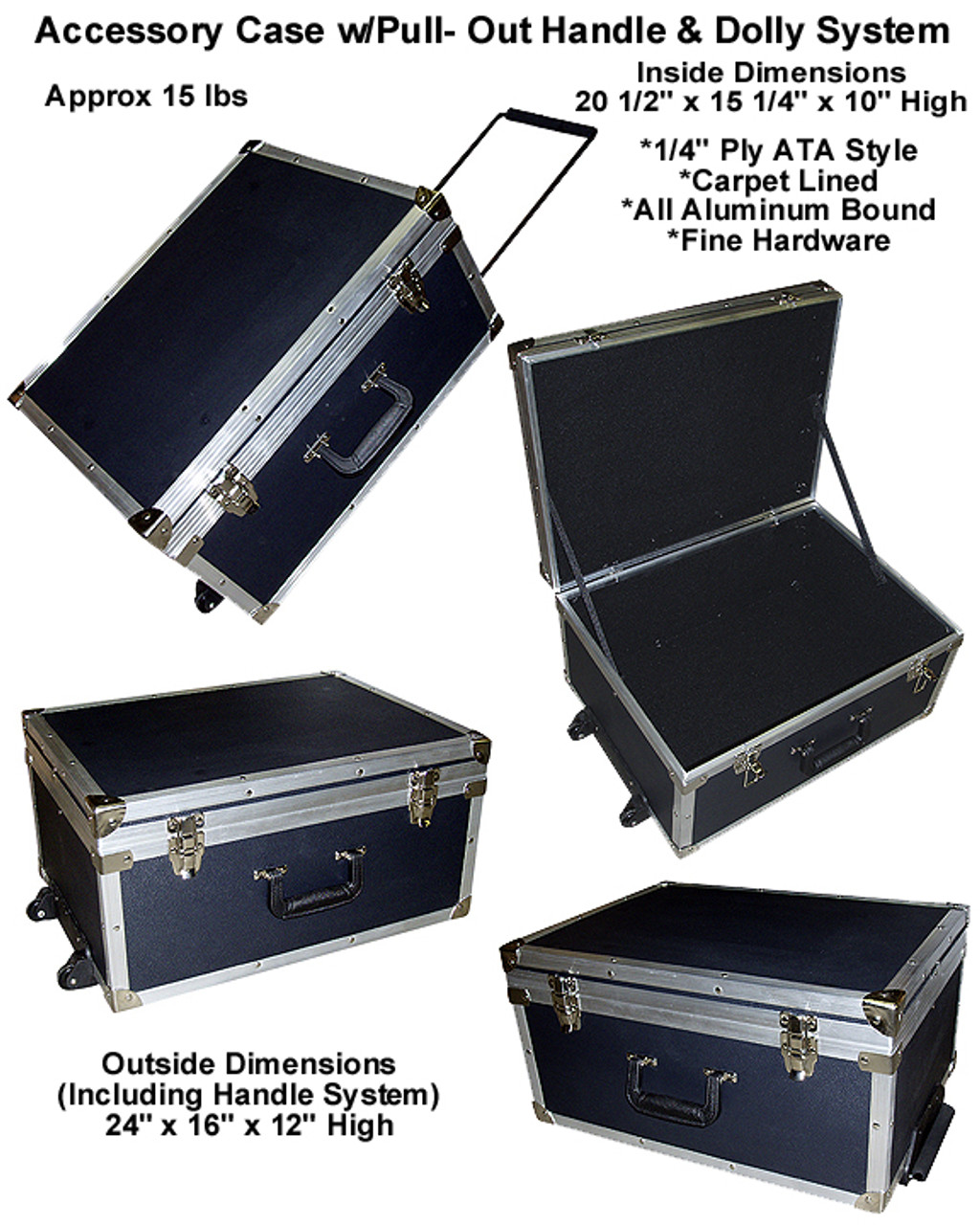 The very useful Utility & Supplies Accessory Medium Duty Case is constructed of 1/4" plywood with a thick black PVC laminate on the outside and a carpet lined interior. The case is assembled with heavy gauge aluminum extrusions machine split riveted throughout and the corners are protected by heavy gauge steel flat corners. All the catches and handle are surface mounted and nickel plated. Latches are specifically designed for for a tight positive closure and brief style handle is for easy lifting. The retractable handle and wheel system makes this case extremely portable and easy to use. We ship to Hawaii & Alaska as well as internationally, but can only provide free shipping to the lower 48 US states at this time. Please email, phone or text us for a quote for air, expedited, and international delivery options.