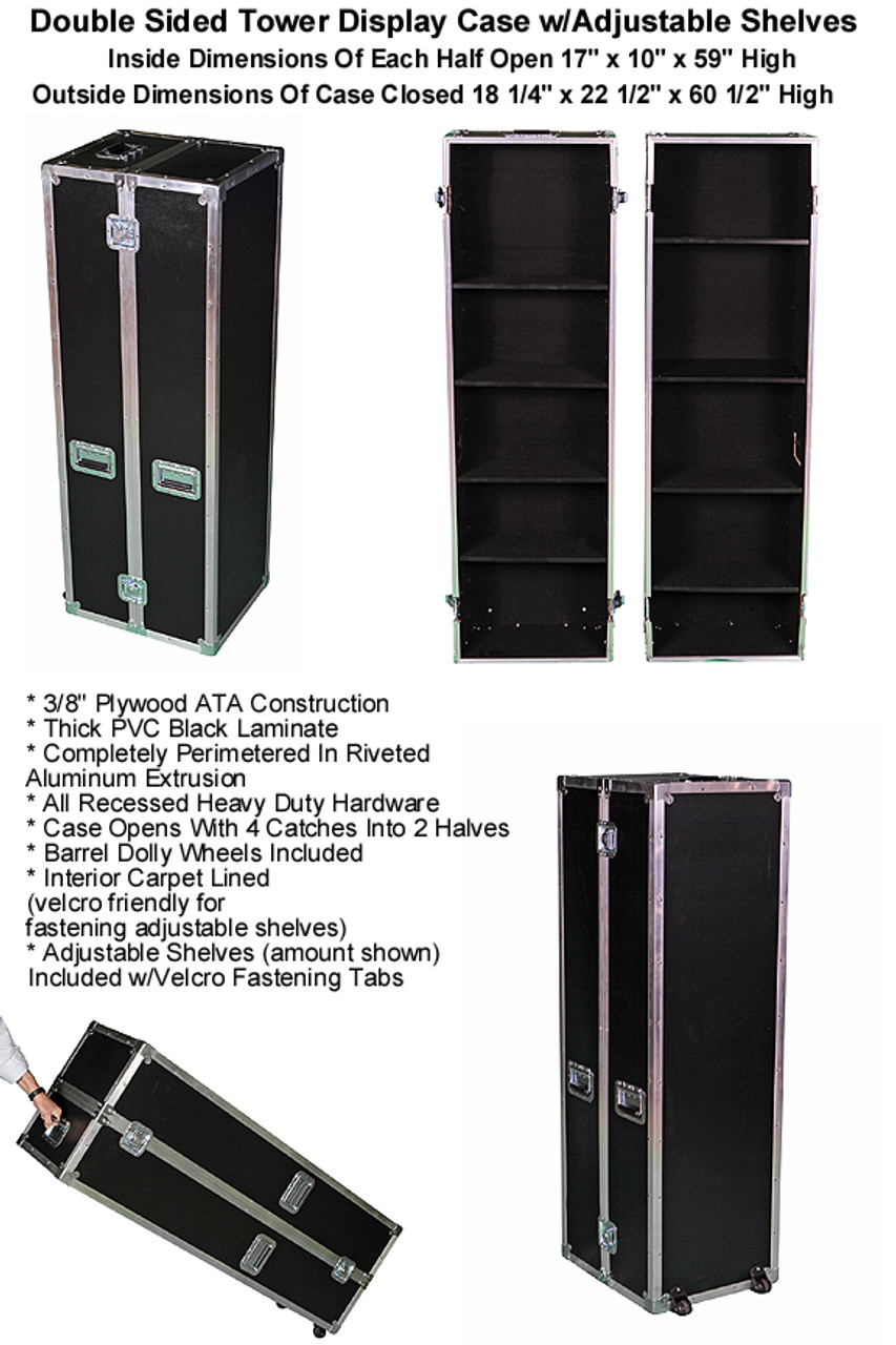 This very versatile Double Sided Display Tower Trunk ATA road case is perfect for the professional vendors out there who need good and reliable cases to protect, transport, and display their expensive products and equipment. The inside is carpet lined for protection and we also offer sheets of foam in 4 thicknesses that can be cut up into strips, pads, or dividers to further protect and organize your products and equipment. Additional shelves are also available for purchase. Make sure you measure your products before purchasing to make sure your products will fit into this case. All dimensions inside and out are shown above.