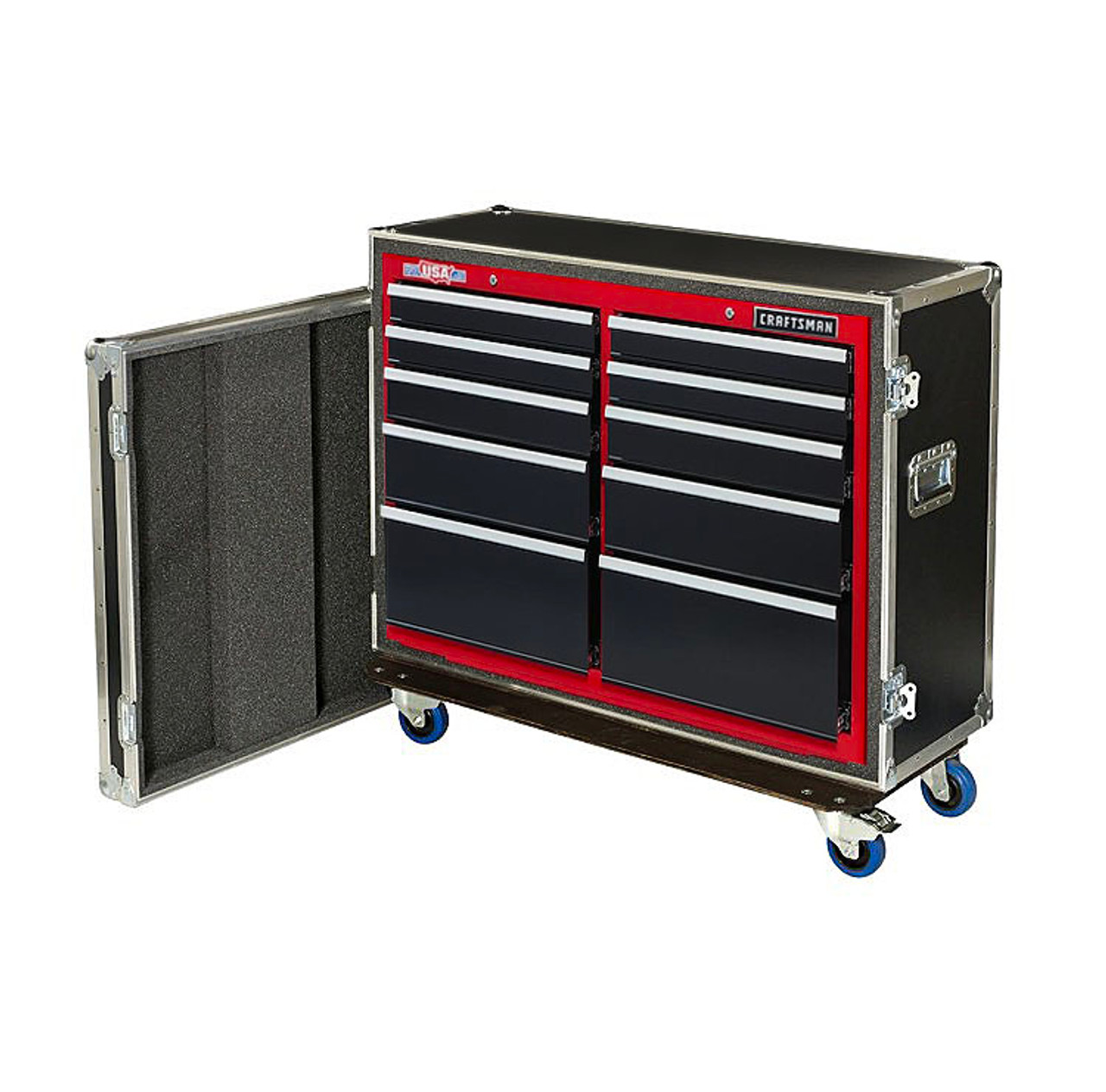 This heavy-duty ATA-style constructed live-in road case with included 52" wide 10 drawer steel tool cabinet is ready for any job. This is a premium 18-20 gauge steel tool cabinet built into a road or flight ready 1/2" ply and 1" foam live in ATA travel case.