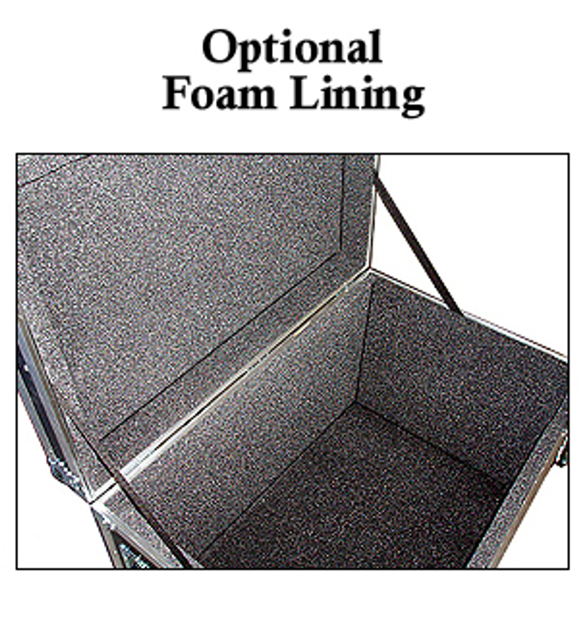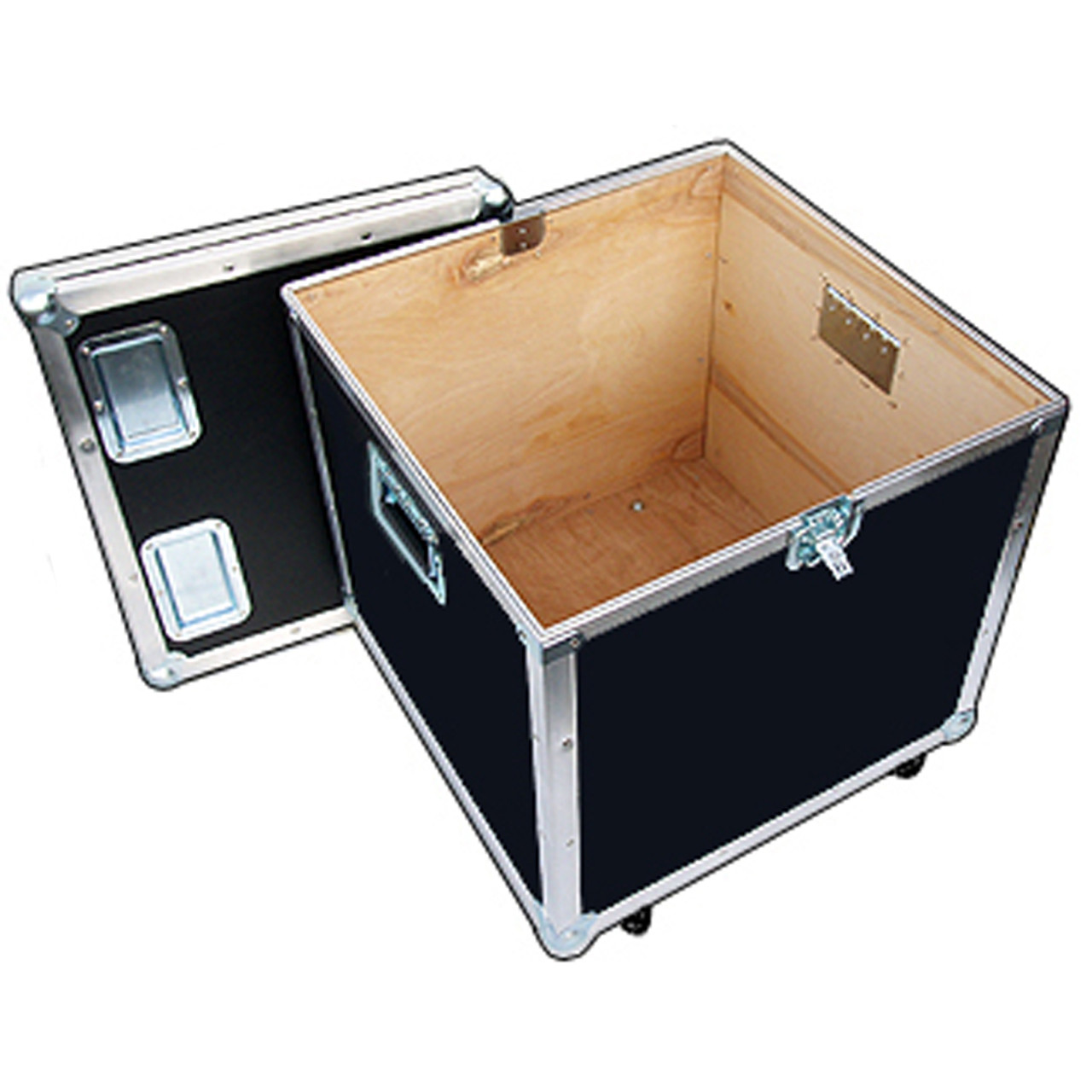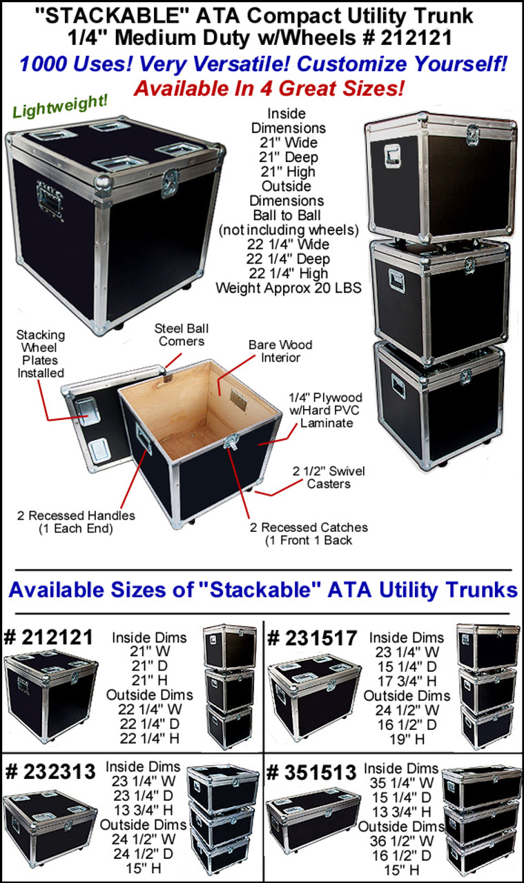Our useful 21”x 21”x 21” stackable 1/4" plywood ATA constructed utility trunk with swivel wheels features a removable lid with four recessed stacking wheel plates installed for easy case stacking. It has a hard PVC laminate exterior, a bare wood interior and two recessed catches and handles. It is made with steel ball corners, heavy gauge aluminum extrusions and is also machine split riveted throughout. Includes four easy to install 2 1/2" swivel casters with the trunk. This is a useful utility case for almost any consolidation or transport purpose. Optional 1/2" Foam lining available at an additional cost. We ship to Hawaii & Alaska as well as internationally, but can only provide free shipping to the lower 48 US states at this time. Please email, call or text us for a quote for air, expedited, and international delivery options.