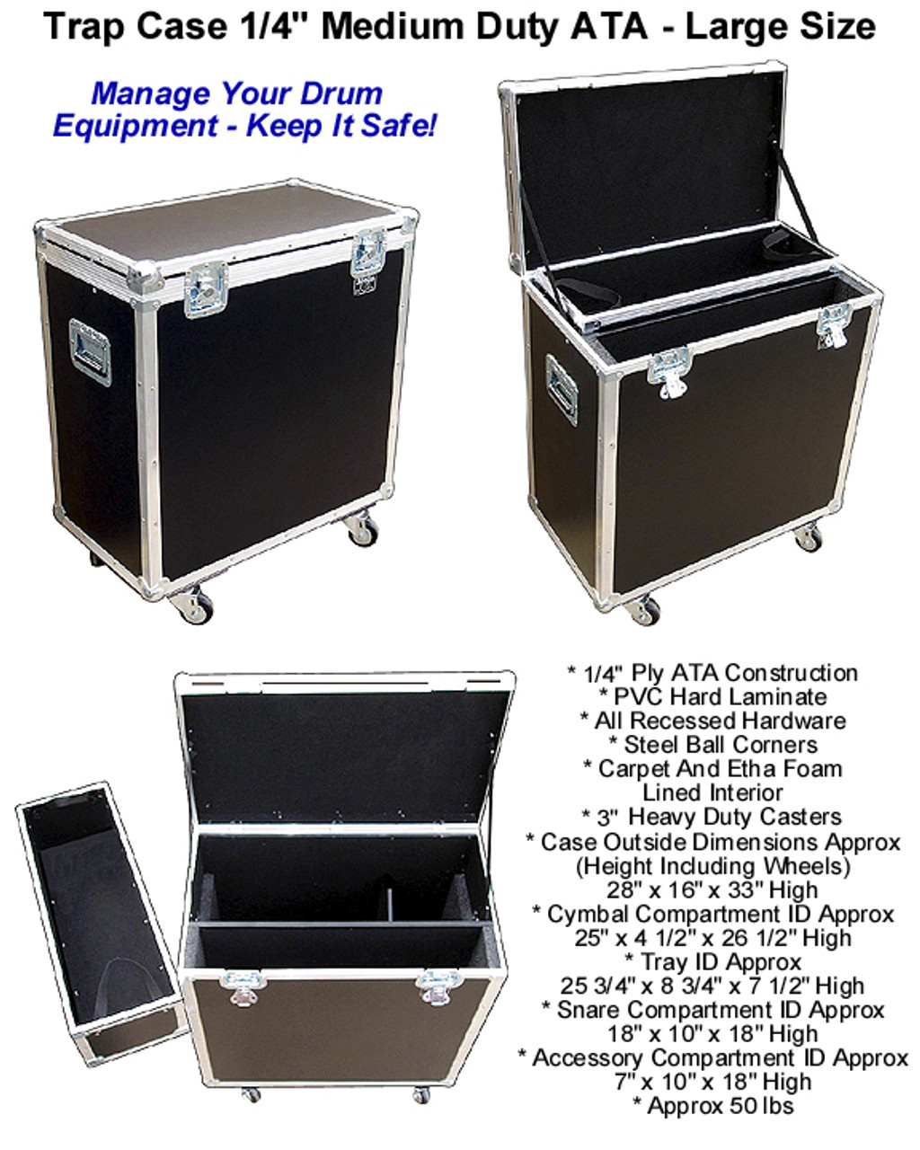 This Trap Case for Drum Equipment 1/4" Medium Duty ATA - Large Size case is just the thing you need to accomplish that task. The case is made from all the finest materials on the market and the workmanship is superb. It has everything you need to transport your expensive tools of the trade and will serve you for many years to come. All dimensions and specs are called out in the photo and bullets above. Shipping includes delivery on the truck to your curb/dock and does not include any "liftgate" fees for unloading. We ship to Hawaii & Alaska as well as internationally, but can only provide free shipping to the lower 48 US states at this time. Please email, phone or text us for a quote for air, expedited, and international delivery options.