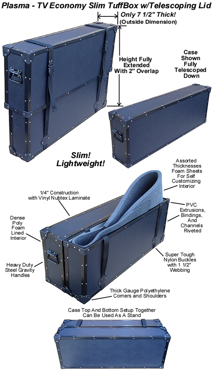 As part of the Tuffbox cases product line, this 50" TV 1/4" 'TuffBox Economy Slim' Light to Medium Duty Road Case w/Telescoping Lid is designed with an Adjustable Telescoping Lid, enabling you to fit and protect plasma screens and LCD or LED screens of many different sizes, saving you money on purchasing other more expensive cases. The TV cases are also lightweight and an economical choice.. These economy TuffBox case ARE NOT FOR SHIPPING OR HEAVY DUTY USE. Use these plasma, LCD and LED cases to transport your screens to local shows, events, concerts, and handle with care. and more, they are also perfect for storage and well protected from harm. These cases fit ONE TV ONLY! We ship to Hawaii & Alaska as well as internationally, but can only provide free shipping to the lower 48 US states at this time. Please email, phone or text us for a quote for air, expedited, and international delivery options.