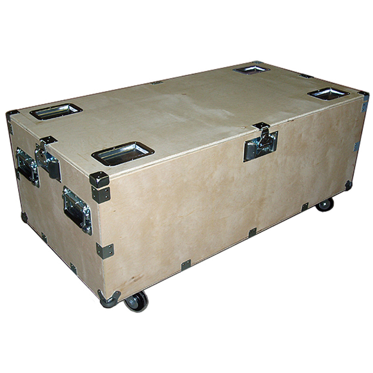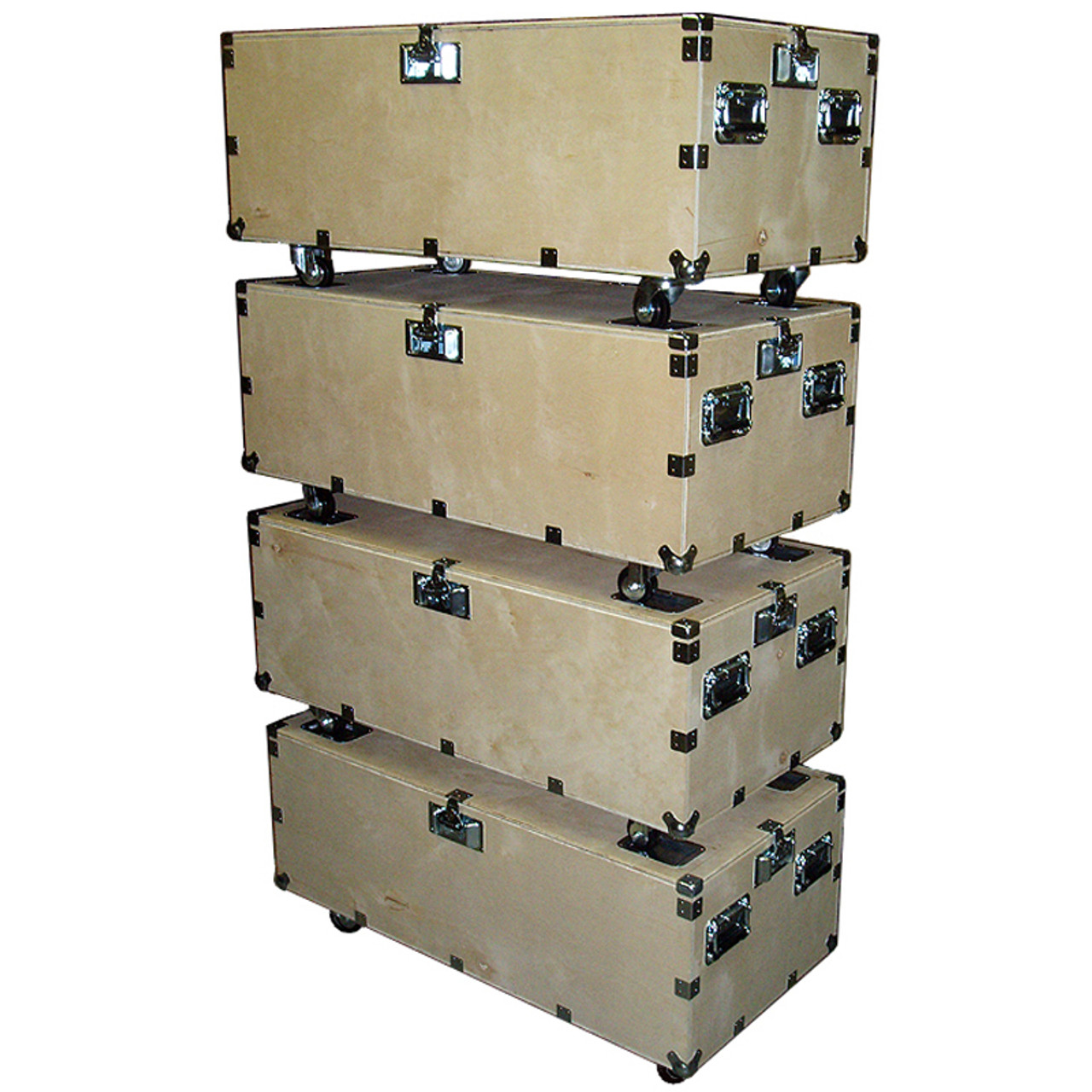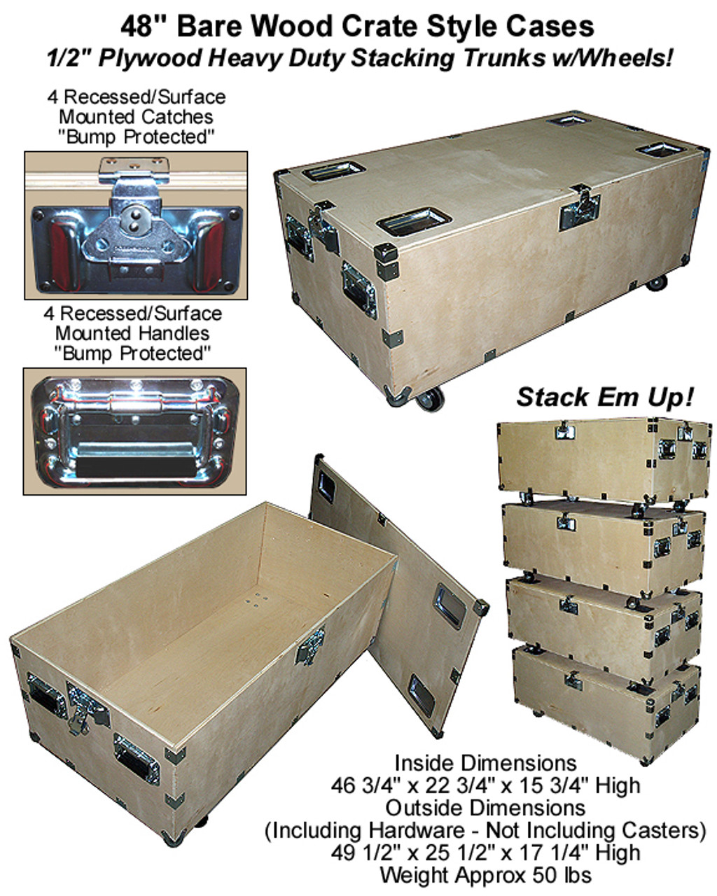 These heavy duty 48" Crate Style 1/2" Trunk cases w/ wheels (4 Piece Stacking Set) are made by a leading case manufacturer and are brand new! All specifications and sizes of the case in this auction are called out in the photo. The cases are constructed of 1/2" bare wood plywood. The cases are assembled with heavy gauge steel fittings machine split riveted throughout and the corners are protected by heavy gauge steel corners. All the catches and handles are spring loaded and a new surface mounted "bump protected" recessed/surface design which are very strong. They are specifically designed for for a tight positive closure and easy lifting. The flat lid comes off and 4 - 3" swivel casters are included which are shipped inside the case and very easy to install using all bolts (supplied). These are very useful utility trunks for almost anything needed to consolidate or transport.