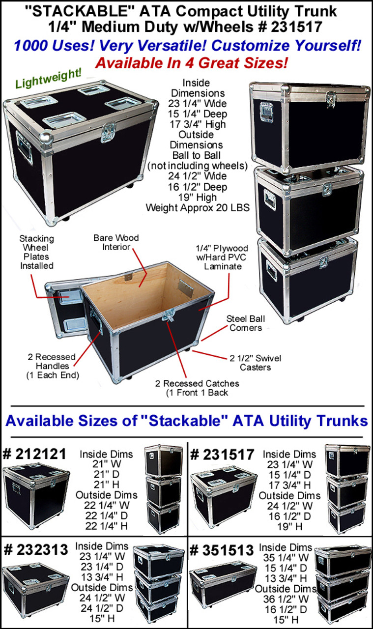 Our useful 23”x 15”x 17” stackable 1/4" plywood ATA constructed utility trunk with swivel wheels features a removable lid with four recessed stacking wheel plates installed for easy case stacking. It has a hard PVC laminate exterior, a bare wood interior and two recessed catches and handles. It is made with steel ball corners, heavy gauge aluminum extrusions and is also machine split riveted throughout. Includes four easy to install 2 1/2" swivel casters with the trunk. This is a useful utility case for almost any consolidation or transport purpose. Optional 1/2" Foam lining available at an additional cost.