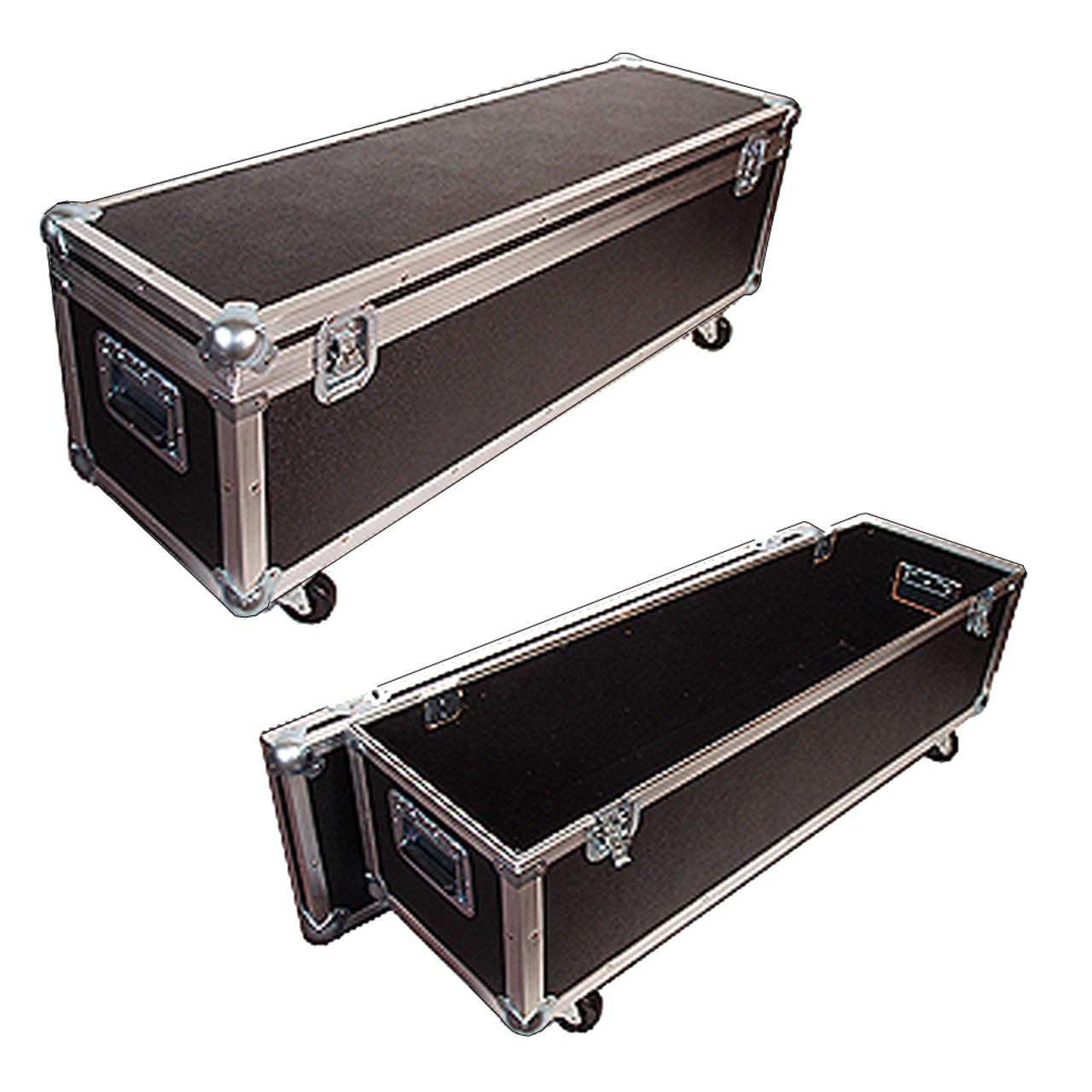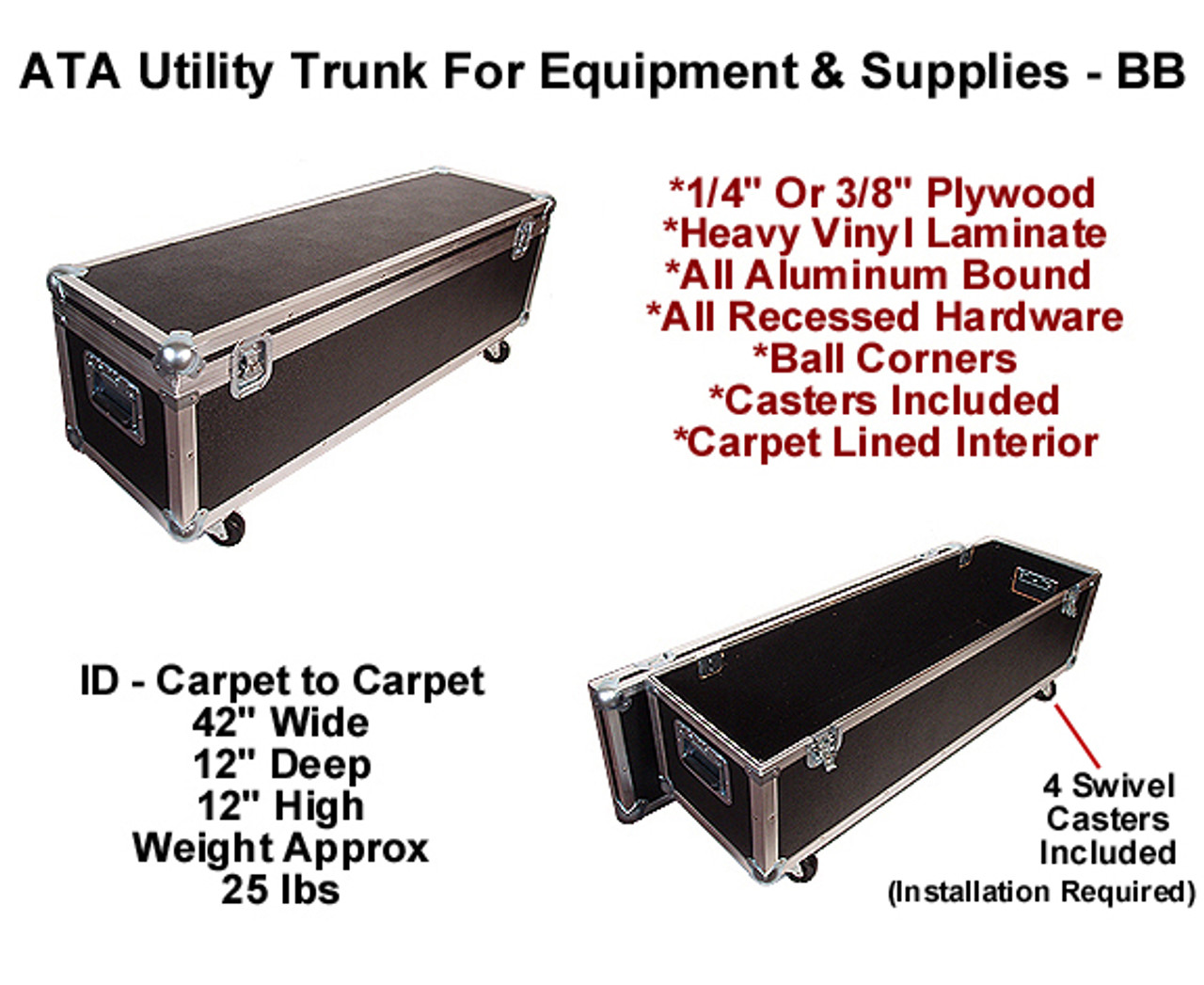 This road trunk equipment case is constructed of 1/4" or 3/8" plywood with a thick ABS laminate on the outside and an interior carpet lining to help protect any equipment transported inside. This sturdy supply trunk with wheels measures 42" x 12" x 12" and is assembled with a heavy gauge aluminum extrusion and machine riveted together. Its closure latches are recessed for protection against sheering off, and its handles are spring loaded for easy lifting. This case also comes with a caster kit included, installation required. This product is made right here in the USA! We ship to Hawaii and Alaska as well as internationally, but can only provide free ground shipping to the lower 48 US states at this time. Please email, phone, or text us for a quote for air, expedited, and international delivery options.