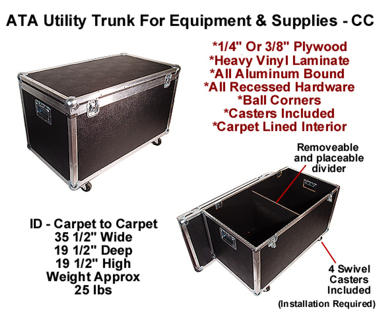 These equipment cases are assembled with either 1/4" or 3/8" plywood with a thick plastic laminate on the outside and a carpet lining inside for reliable equipment protection. The case is surrounded with a heavy gauge aluminum extrusion and is machine split riveted together. Closure latches are recessed for protection and the handles are spring loaded for easy lifting. There is also a caster kit included to aid with the unit’s maximum mobility. Please note that installation is required for these casters. The approx. inside dimensions of this supply trunk with wheels is 35 1/2" x 19 1/2" x 19 1/2" high. We ship to Hawaii & Alaska as well as internationally, but can only provide free shipping to the lower 48 US states at this time. Please email, phone or text us for a quote for air, expedited, and international delivery options.
