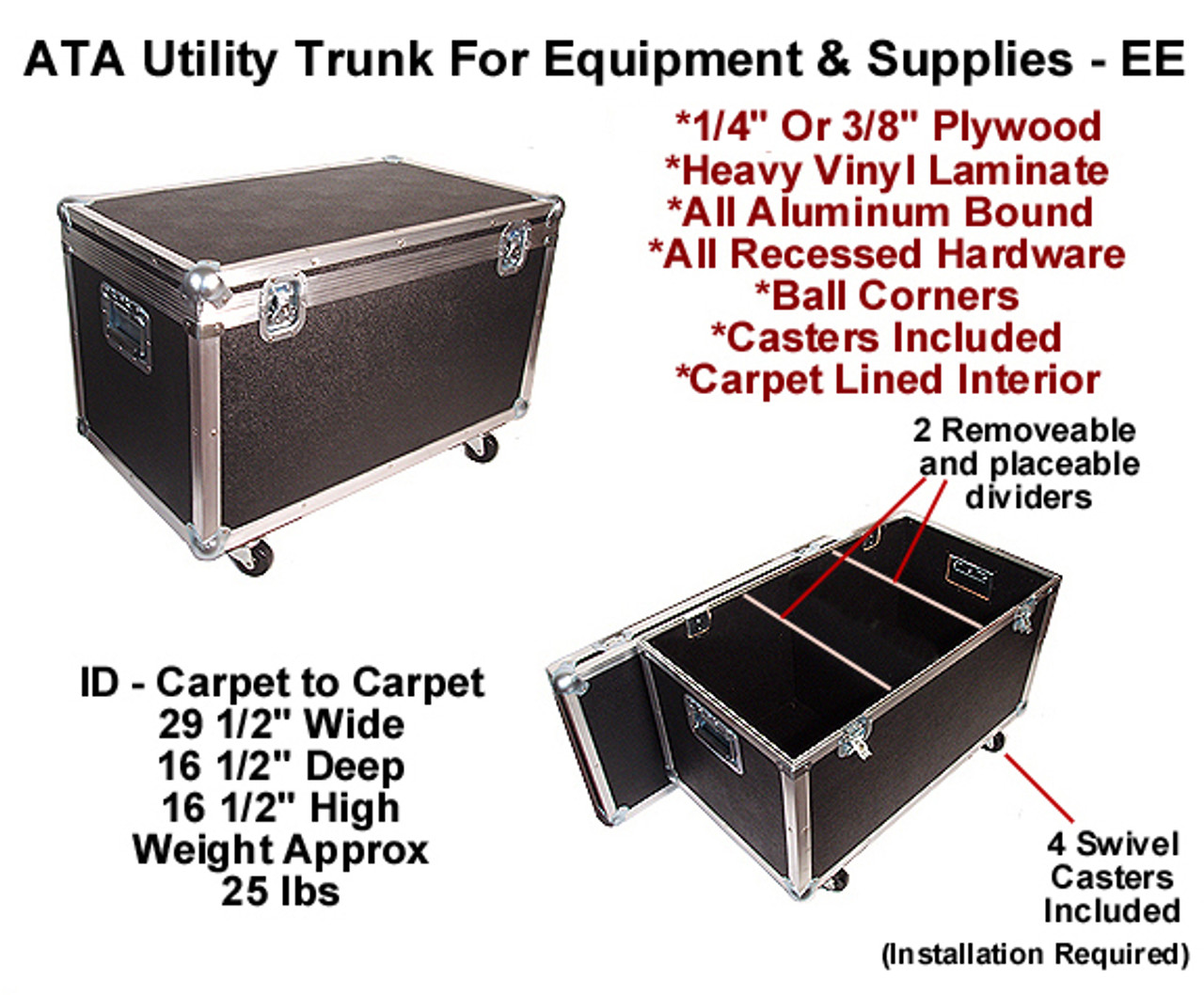 Our equipment cases are constructed of 1/4" or 3/8" plywood with a heavy PVC vinyl laminate on the outside and a black interior carpet lining inside to help protect any equipment that is transported in it. This powerful supply trunk with wheels measures 29.5" x 16.5" x 16.5" and features a machine split riveted design with ball corners and swivel casters (installation required.) Its closure latches are recessed for protection against sheering off, and its handles are spring loaded for easy lifting. Built for sturdiness, reliability and ease of use, Road Cases USA offers the premier choice in equipment transport and protection. We look forward to supporting your aspirations today! We ship to Hawaii & Alaska as well as internationally, but can only provide free shipping to the lower 48 US states at this time. Please email, phone or text us for a quote for air, expedited and international delivery options.