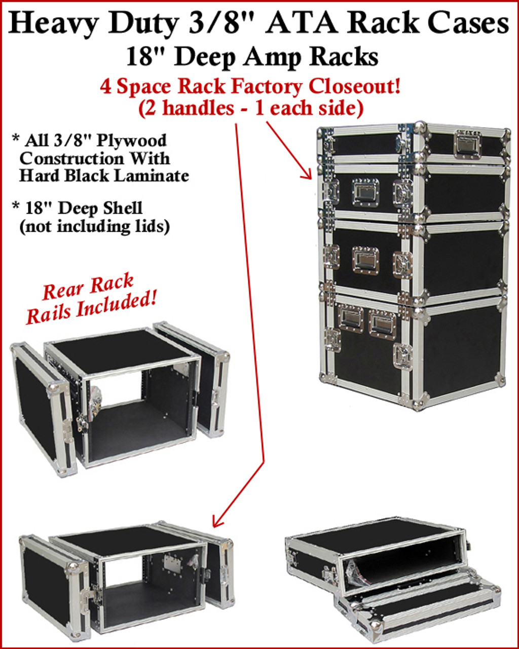 Our classic Signature Series 4 space (4u) 18 inch deep rack case is made to ATA spec with 3/8" ply (perfect for flying / shipping) and heavy duty hardware including rear rails and mounting bolts for your equipment. The exterior has a thick PVC plastic laminate and is riveted with heavy gauge aluminum extrusions throughout. It features all large recessed hardware and large steel ball corners. Dolly wheels and telescoping handle available as an option.