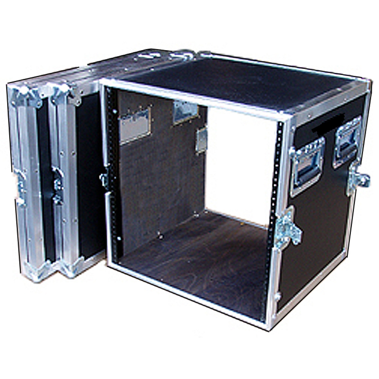 Our classic Signature Series 10 Space (10U) 24 inch deep rack mount case is made to ATA spec with 3/8" ply (perfect for flying / shipping) and heavy duty hardware. The exterior has a thick PVC plastic laminate and is riveted with heavy gauge aluminum extrusions throughout. It features all large recessed hardware and large steel ball corners. This case comes standard with threaded rails in both the front and rear with the option for dolly wheels and telescoping handle to be added.
