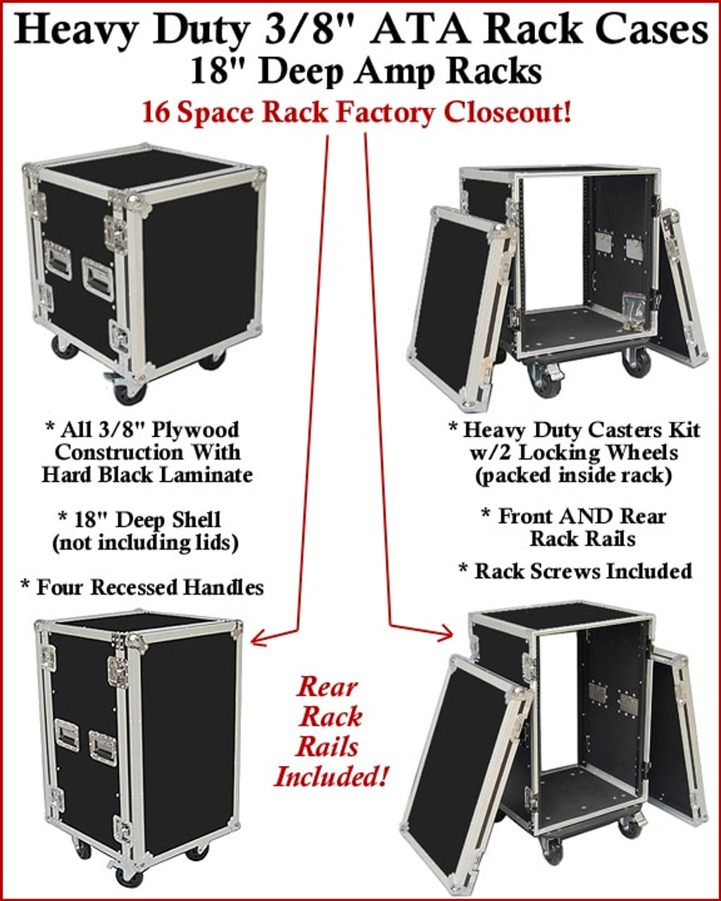 This is my second purchase from Road Case USA! I am all around very satisfied with my 16u 18" deep rack case. Came with hardware and nice heavy duty casters!