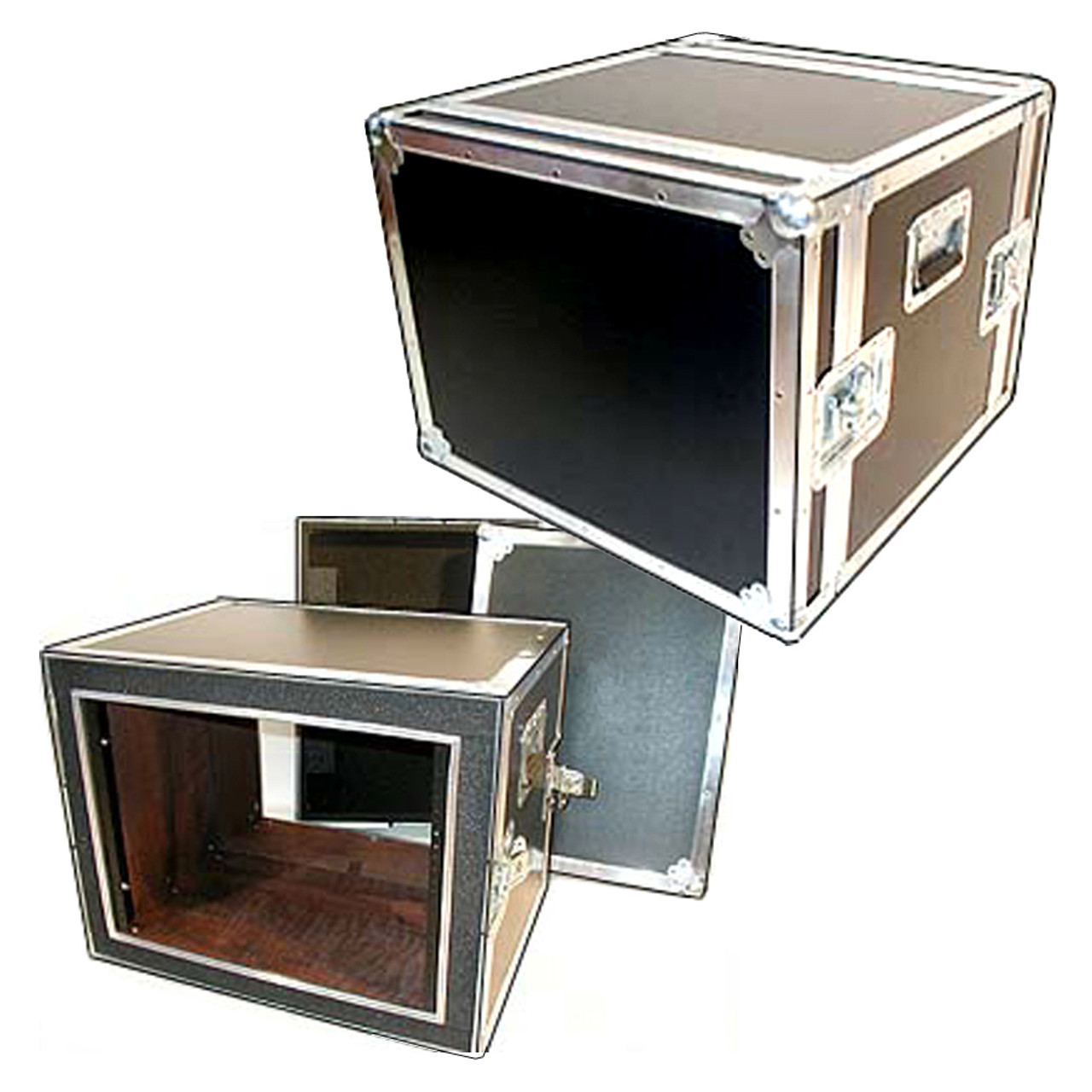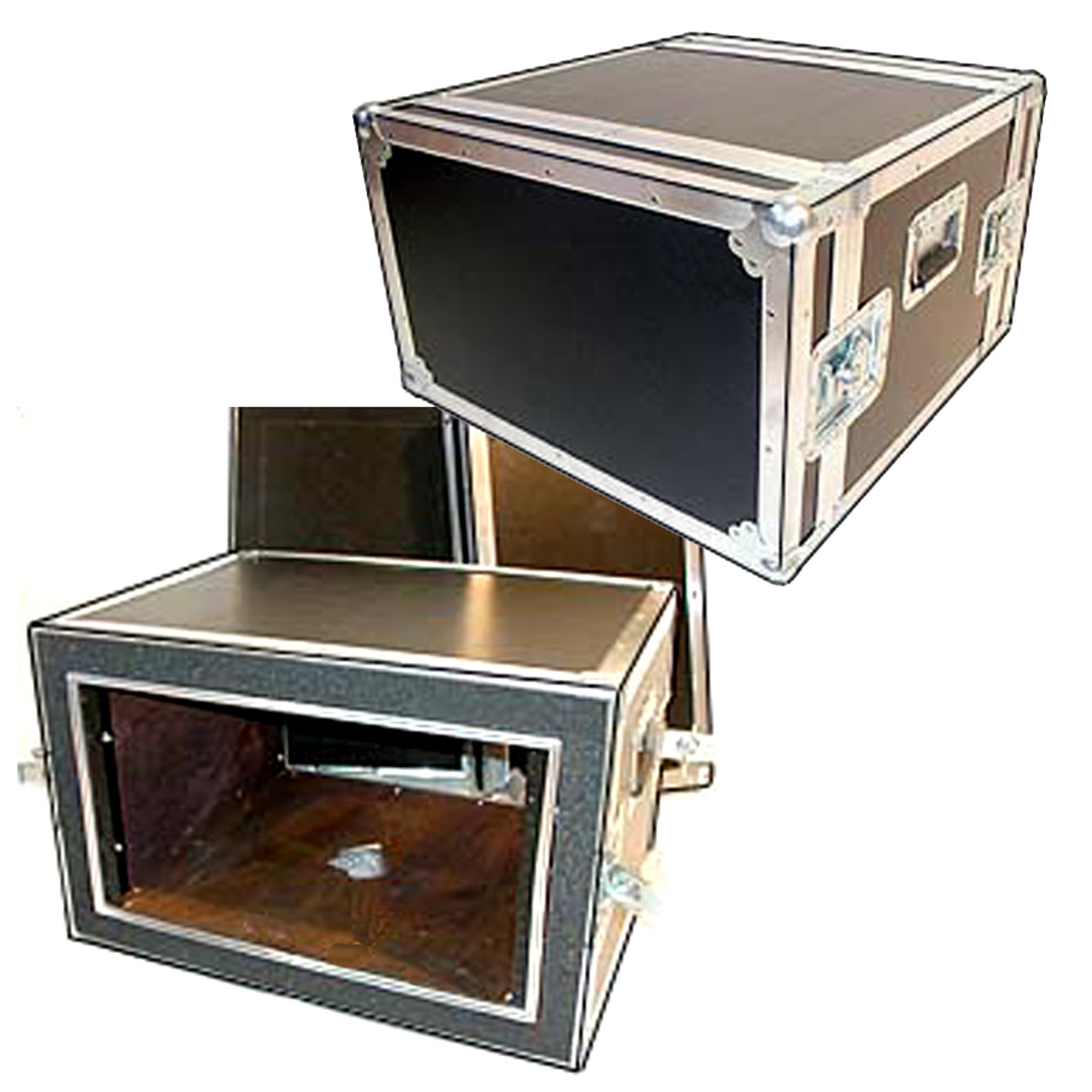Our 3/8” Full ATA Shock Rack Case 4 or 6 Space unit is constructed of thick plywood (inner and outer shells) with a thick PVC hard black laminate and completely surrounded with heavy gauge aluminum extrusion, which is permanently machine riveted together. It has a tongue & groove valence made of aluminum extrusion and is secured by large heavy duty butterfly recessed twist catches. Four recessed handles are supplied for ease of handling, and the case has a painted bare wood inside shell, which is 24" deep not including the back lid (which adds another 2" to the depth). There is an option for heavy duty 4" casters as well as an upgrade to 1/2" Plywood.