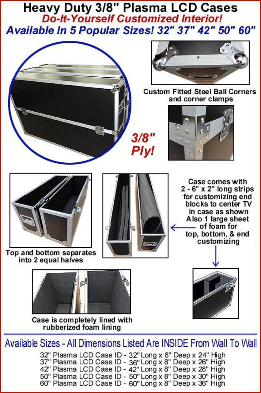 The heavy duty LCD flat screen TV cases for 32" class screens are made with 3/8" plywood and a hard black laminate, and are ATA cases suitable for storage and shipping. The LCD cases can be separated into two halves so that you can easily slide in your equipment, and the foam stripping can be cut to the desired lengths and sizes to accommodate your LCD, LED or plasma screens. Get this LED case now at a great price and ensure the protection of your TV equipment. We ship to Hawaii & Alaska as well as internationally, but can only provide free shipping to the lower 48 US states at this time. Please email, phone or text us for a quote for air, expedited, and international delivery options.